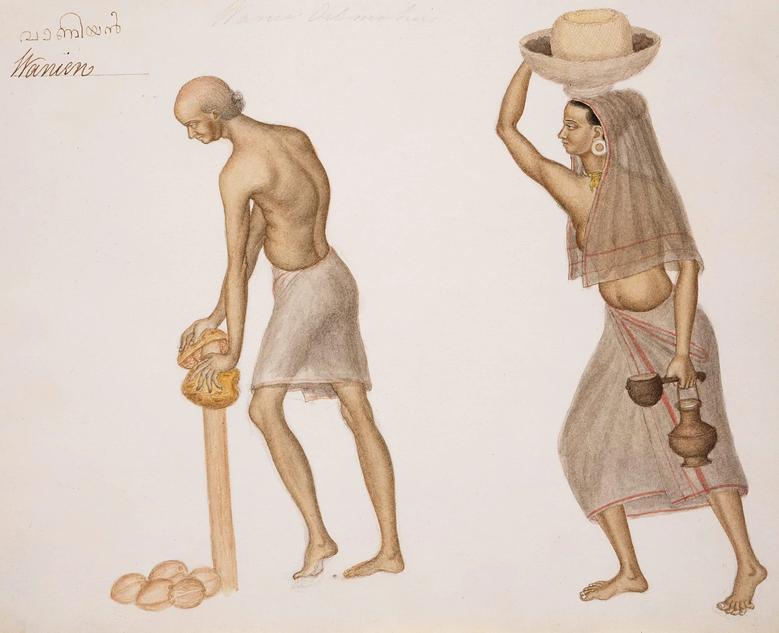 The painting has three subject identifications written along the top. The Tamil inscription reads, vaniyan. (Translation by Stephen Markel.) The Vaniyan (or Vanniyar or Palli) are a south Indian indigenous agrarian community. The English inscription on the left reads, “Wanien,” which is a 19th-century transliteration of vaniyan. The faint English inscription in the center reads, “Wanie Oilmaker”(?). It likely refers to the Vaniyans’ traditional occupation as oil mongers, including coconut oil. In this vocational illustration, an elderly man husks coconuts on a wooden pole. Behind him is his wife(?) with a basket on her head and carrying a ladle and ewer, which is filled with white coconut milk. The somber brown palette and naturalistic figures with stippled shading and touches of color are stylistically derived from British prints. Such paintings of castes and occupations were produced for English East India Company officials and military stationed in the Malabar District of the Madras Presidency (1800-1947). A comparable painting of Malabar coconut gatherers is in the Victoria and Albert Museum, London (IS.262-1951).