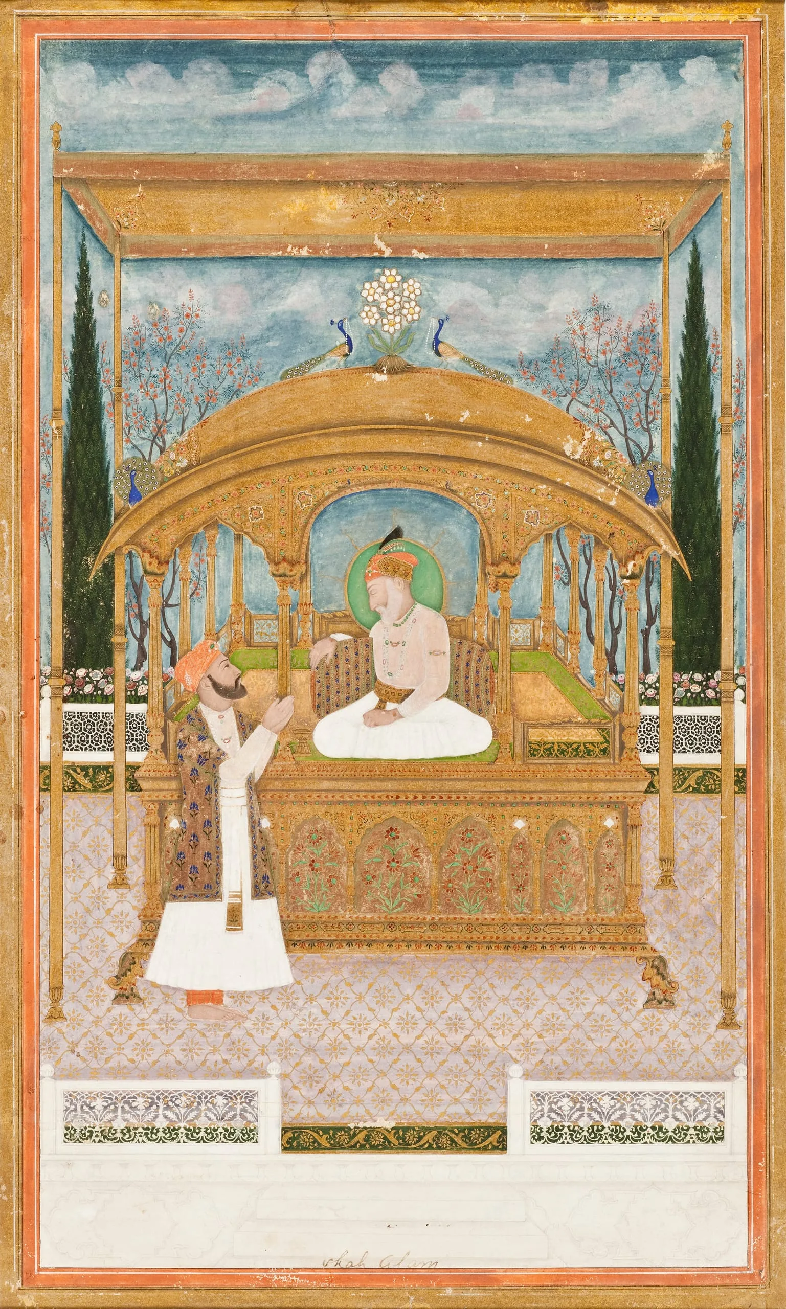 The blind Shah Alam II is seated on a replacement Peacock Throne, the original of which was plundered by the Iranian King Nadir Shah (r. 1736-1747) during his sack of Delhi in 1739. He is granting an audience, perhaps to a minister. A Persian inscription on the reverse lists the emperor’s epithets, the signature of the artist, Khairullah Musawir (India, active 1800-1815), and the date AH 1215 (1800-1801 CE). (Translation by Z. A. Desai.)