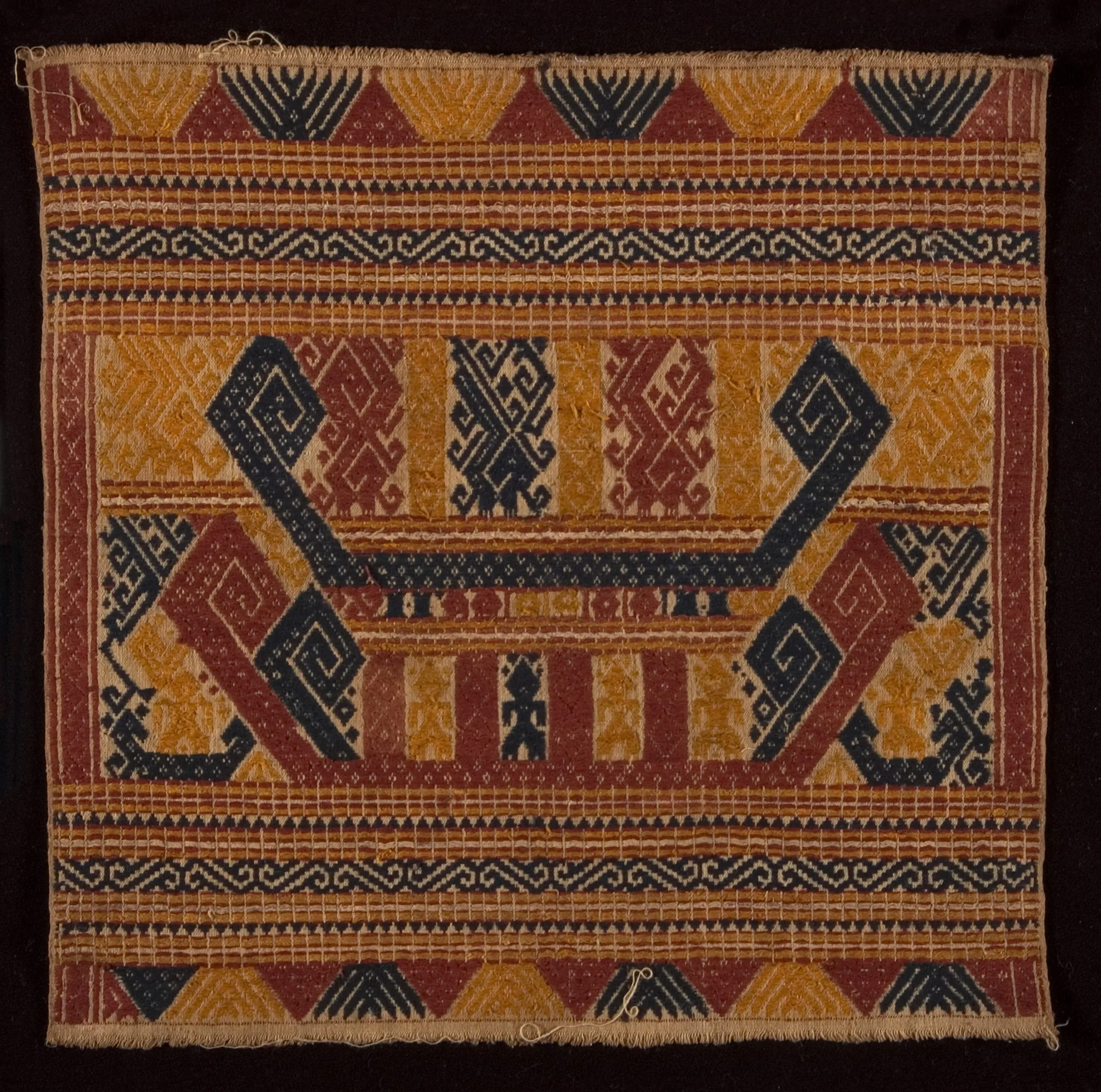 Woven textile panel with dense geometric patterning in brick red, marigold yellow, and navy blue, featuring horizontal bands, a central U-shaped motif, and border rows of triangular fan forms