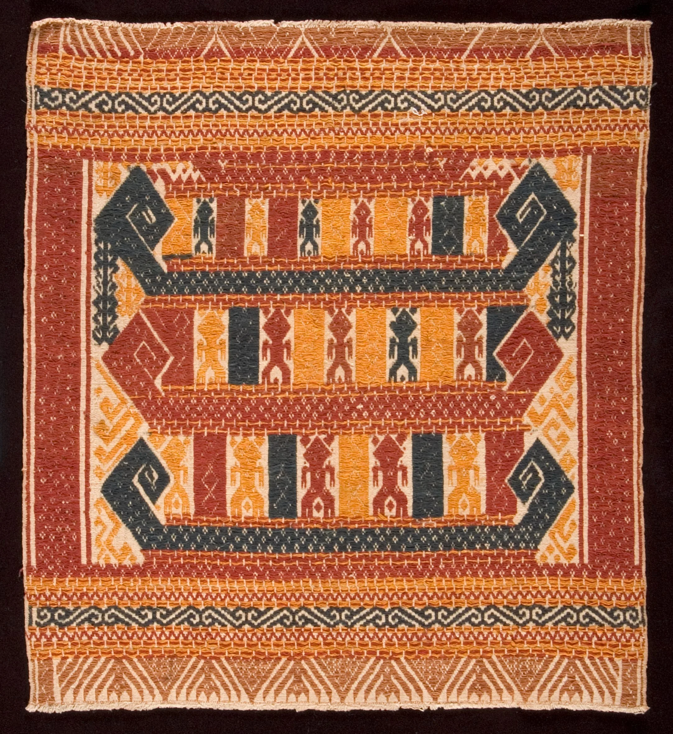 Handwoven textile with symmetrical geometric patterning in brick red, marigold orange, slate blue-gray, and cream, featuring a central stepped boat-like form with stylized figures