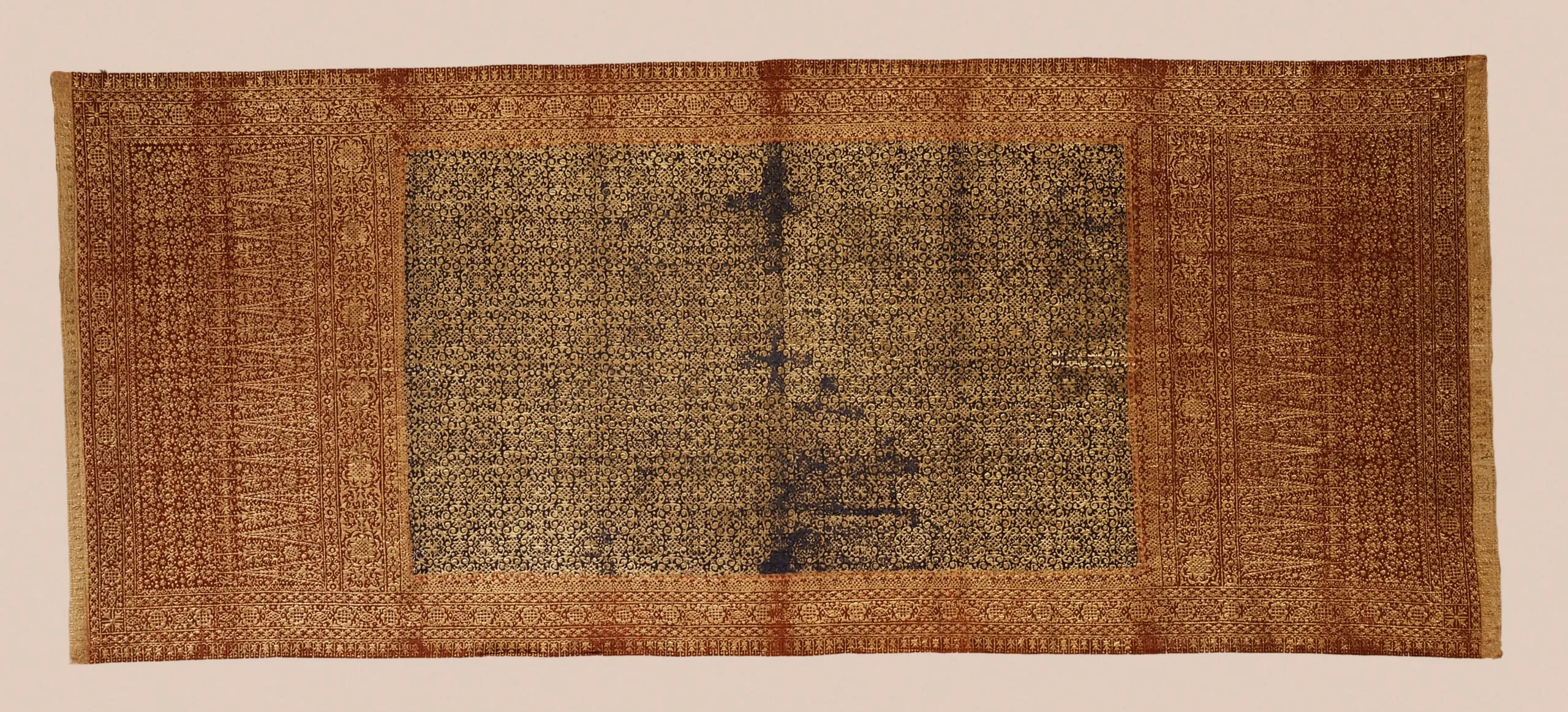 - Silk; gold leaf gluework, stitch-resist (tie-dyeing)