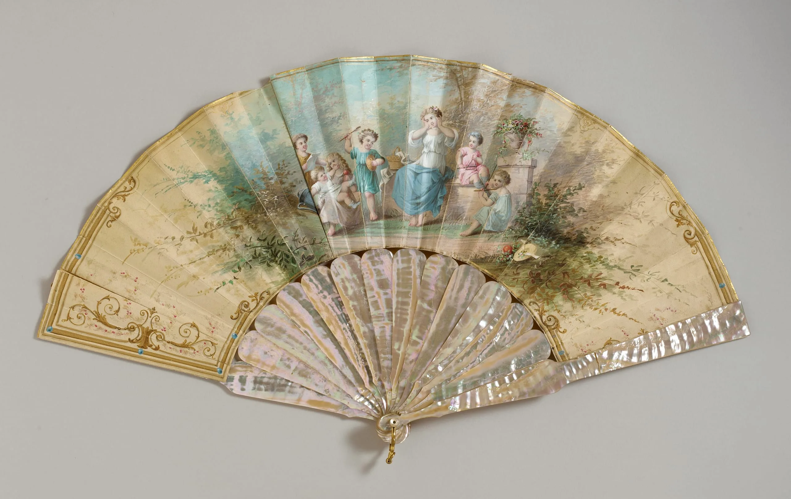 - Gouache, watercolor and gold paint on paper leaf, mother-of-pearl sticks, gold-toned metal loop with terminus ring, mother of pearl button, metal rivet