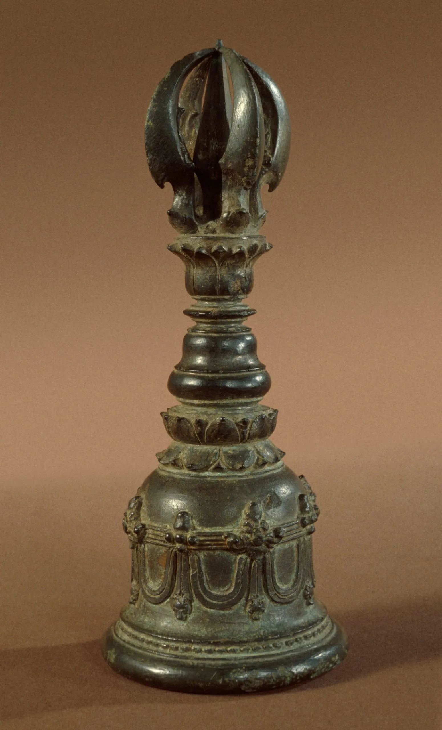 Javanese ritual priest’s bells (ghanta) are distinguished from hanging bells by having clappers to ring the bell and by the finial above the collar for gripping it being in the form of a five-pronged thunderbolt (vajra). In esoteric Buddhism, the thunderbolt symbolizes the adamantine or unchanging nature of eternity and the male component of compassion. The bell represents the female aspect of wisdom. The pairing of the thunderbolt and bell embodies the enlightened state of compassion and wisdom achieved through the perfect union of the male and female principles. A double lotus base is at the junction of the collar and stupa-shaped bell, which is adorned with pendant garlands. Although not depicted here, Central Javanese Buddhist priest’s bells often have four faces representing the five Jina Buddhas (the fifth face is understood). In Eastern Javanese priest’s bells, the exterior of the bell is typically plain and shaped like a hemisphere rather than a stupa. See J. E. van Lohuizen-de Leeuw, Indo-Javanese Metalwork (Stuttgart: Linden-Museum, 1984), pp. 95-111, nos. 61-77; Pauline Lunsingh Scheurleer and Marijke J. Klokke, Divine Bronze: Ancient Indonesian Bronzes from A.D. 600 to 1600 (Leiden: E. J. Brill, 1988), pp. 119-122, nos. 67-70; and Jan Fontein, The Sculpture of Indonesia (Washington: National Gallery of Art, 1990), pp. 238, 243-244, nos. 71, 76-77.