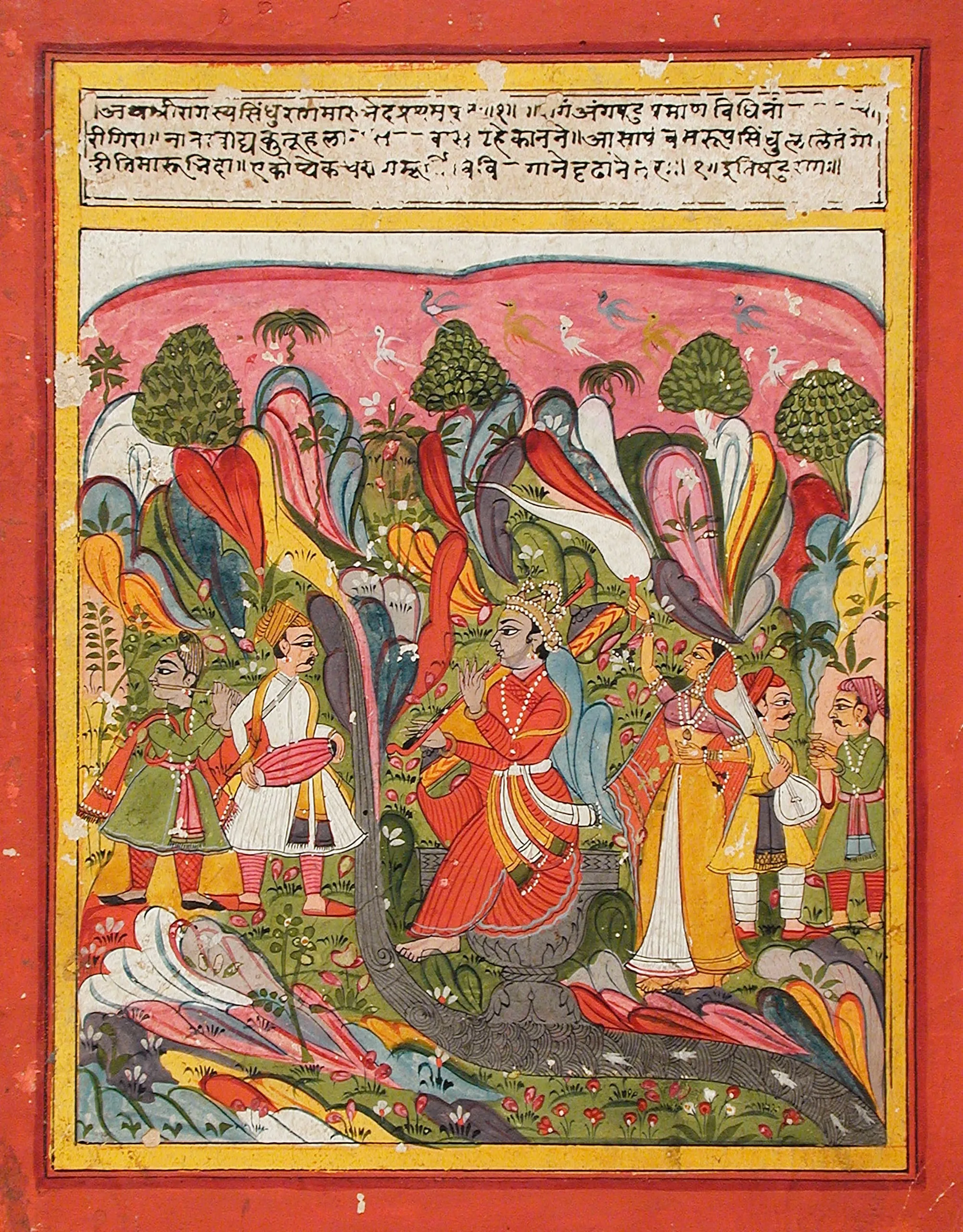 The partially effaced Sanskrit inscription in the header describes Sindhu Ragaputra, the son of Shri Raga, in the desert or Marwar tradition (Marubheda) as someone who is curious about many instruments and is engaged in singing. This is an unusual iconography, as Sindhu Ragaputra is more commonly portrayed in other ragamala regional traditions as a solitary or battling warrior.