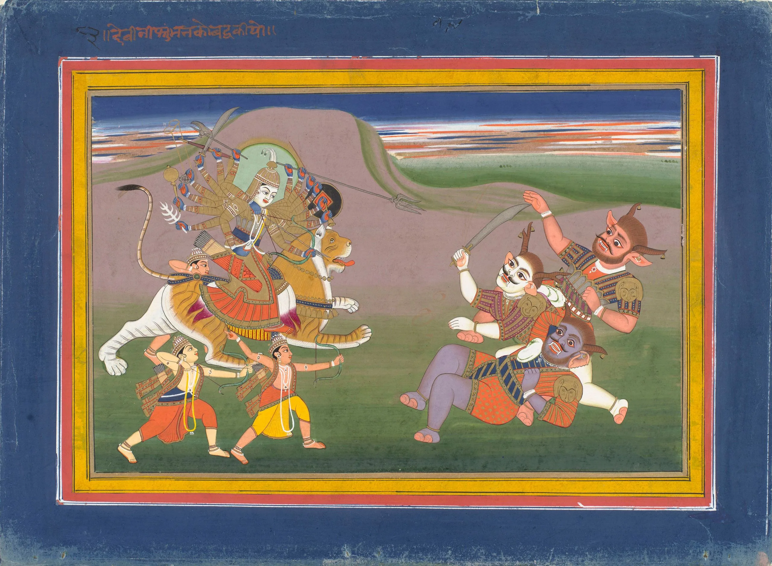 This folio illustrates the climax of Chapter 9, “The Slaying of Nishumbha.” The Hindi inscription in the upper border states, “Devi has killed Nishumbha.” The multi-armed Goddess wears golden armor and rides a hybrid leonine beast with tiger markings. Known as a liger or tigon depending on the gender and species of the parents, lions with tiger stripes have been bred in captivity since at least the early 19th nineteenth century and were a popular motif in 19th-century northern Indian paintings. The Goddess is joined in battle by three generic gods. Nishumbha, who is likely the fallen demon laying on his back, is accompanied by two other demonic titans who have also been defeated.