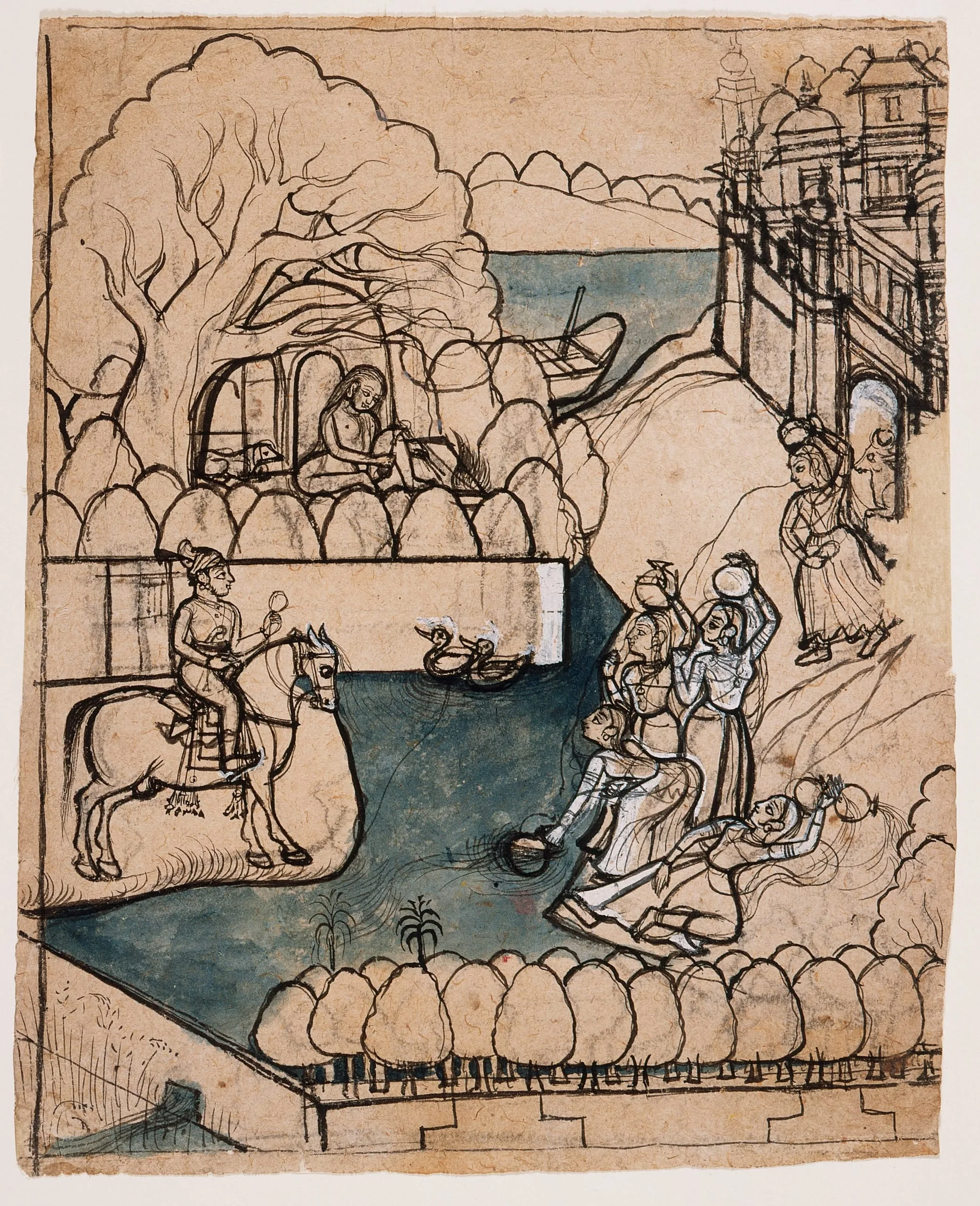 - Ink and opaque watercolor on paper