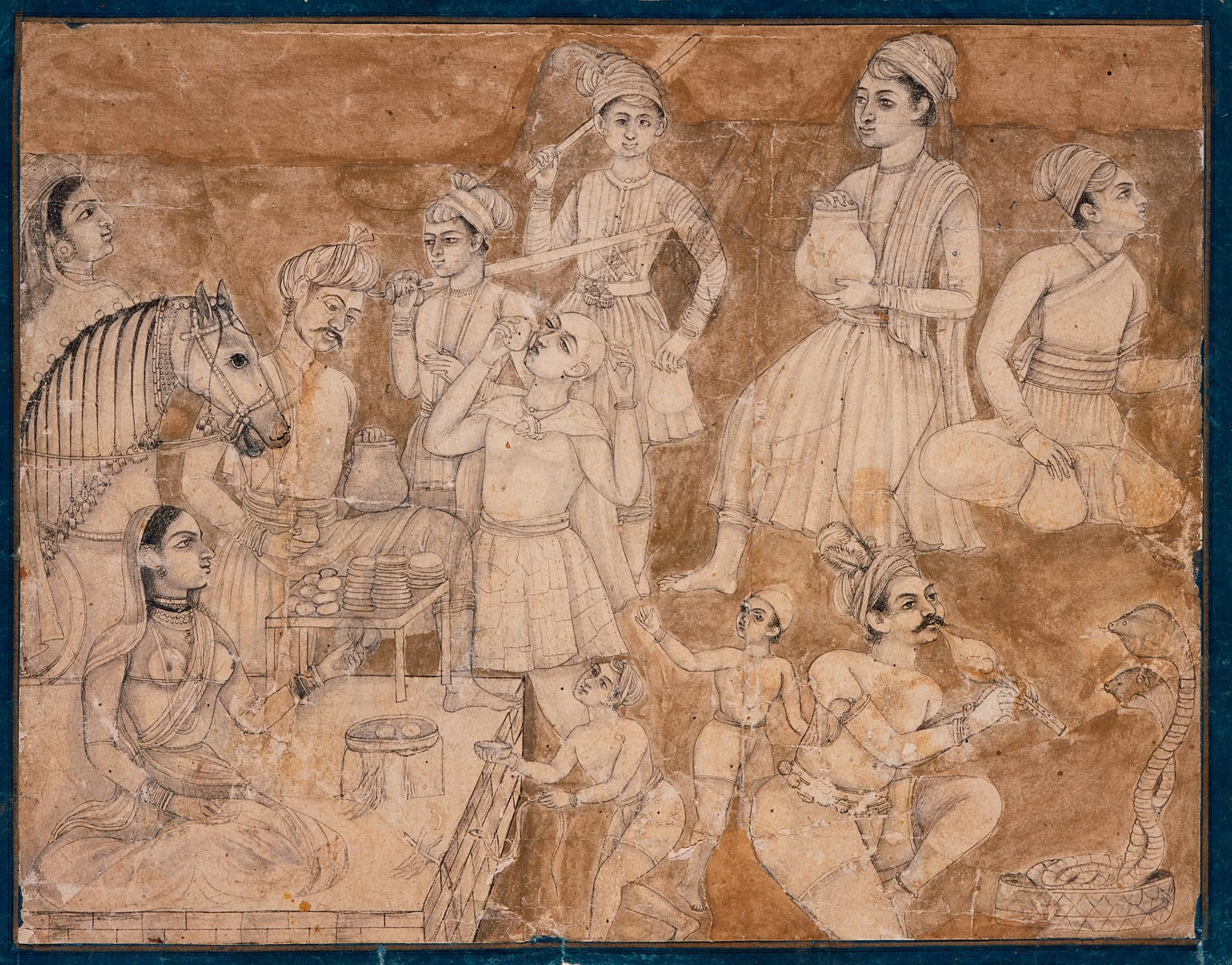 According to an inscription on the reverse, this fragmentary drawing was once in the collection of Nawab Shuja al-Daula (r. 1754-1775). It depicts a refreshment stall in a bazaar with a woman on a platform selling fried sweets and tea. Behind her is a caparisoned horse and its dismounted rider who stands with his left foot on the platform and is about to pour a cup of libations from a jug. Various other animated figures approach the stand for a drink or are bringing a pitcher of replenishments. In the bottom right, a snake charmer mesmerizes two cobras with his children nearby. The child approaching the vendor carries a cup and holds a snake.