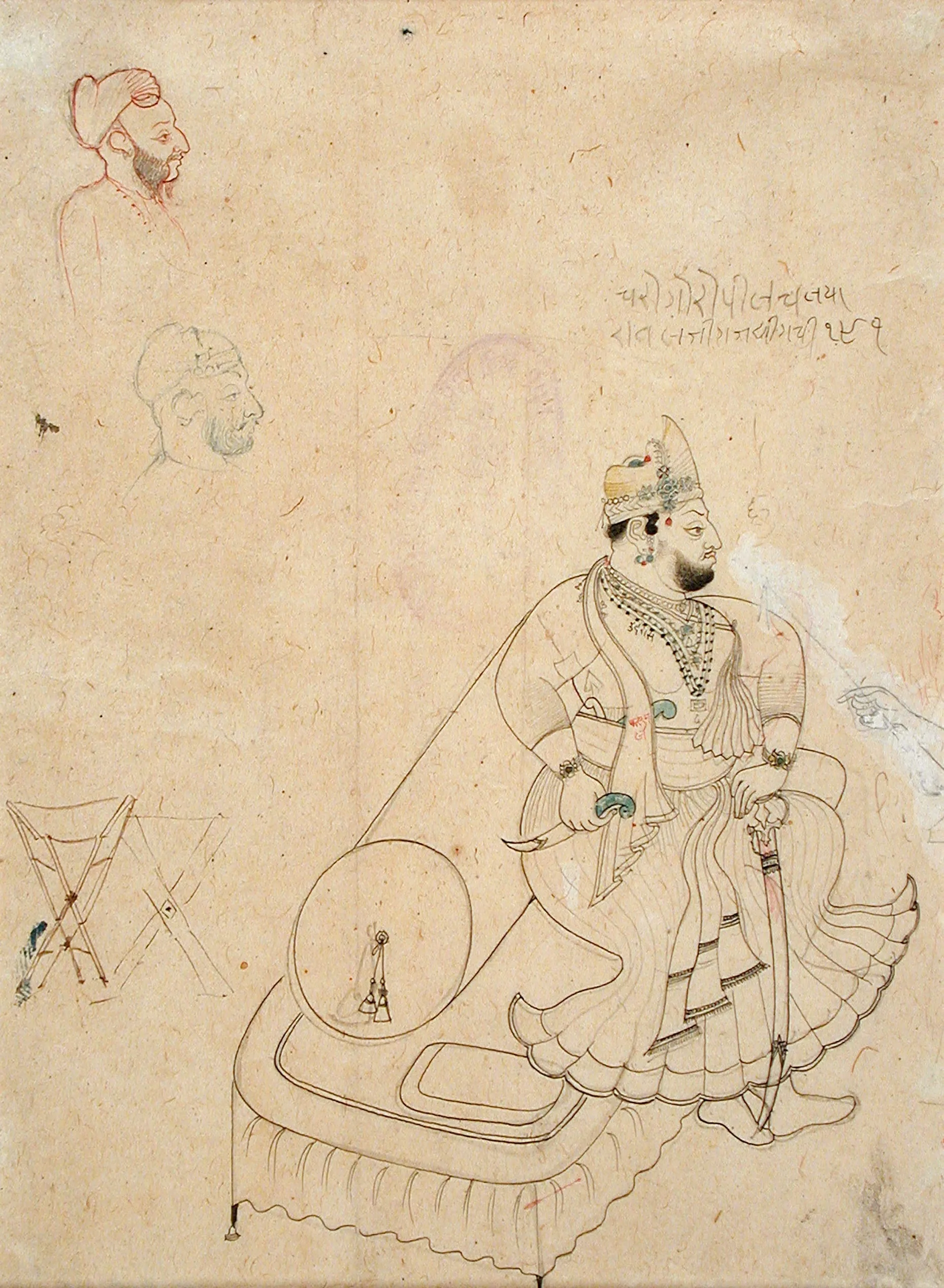 As identified by the devanagari inscription, the subject of this fragmentary unfinished preliminary portrait is “Rawal Gaj Singhji.” “Rawal” (from Sanskrit: rajakula, “royal family”) was the hereditary title of the Jaisalmer rulers. Maharawal Gaj Singh of Jaisalmer (r. 1820-1846) was born in 1800 and died in 1846. In 1821 he married Maharajkumari Rup Kunwar, a daughter of Maharana Bhim Singh of Udaipur (r. 1778-1828), during a period of reenergized prosperity for Mewar after its economy collapsed due to incessant tribute demands by the encroaching Marathas. Facing Maratha as well as Jodhpur incursions, Gaj Singh’s grandfather, Maharawal Mulraj Singh II (r. 1762–1820) had signed a protection alliance with the British East India Company in December 1818 but died ten months later. Due to the death of his father and the murder or exile of his uncles, in 1820 Gaj Singh was selected to rule Jaisalmer.