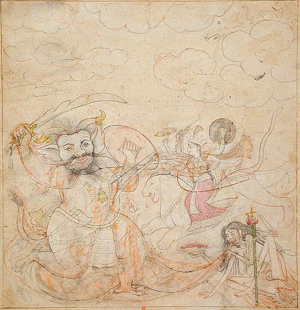This unfinished or preparatory drawing illustrates the climax of Chapter 8, “The Slaying of Raktabija.” The demon Raktabija had been granted a boon from the god Shiva that if a drop of blood from his body fell on the battlefield, an identical demon would arise from the blood and fight the enemies. Each time the Goddess and the Mother Goddesses wounded him, the resultant blood drops engendered another demon, thus causing hordes of demons to join the battle. The Goddess therefore called on the horrific goddess Kali to drink all his falling blood drops before they could hit the ground. The Goddess then slew Raktabija with her multiple weapons. Here, Kali is capturing the demon’s blood drops on her lolling tongue and drinking the blood from a skull cup. The Goddess riding her lion attacks the demon. Celestial divinities herald the auspicious event.