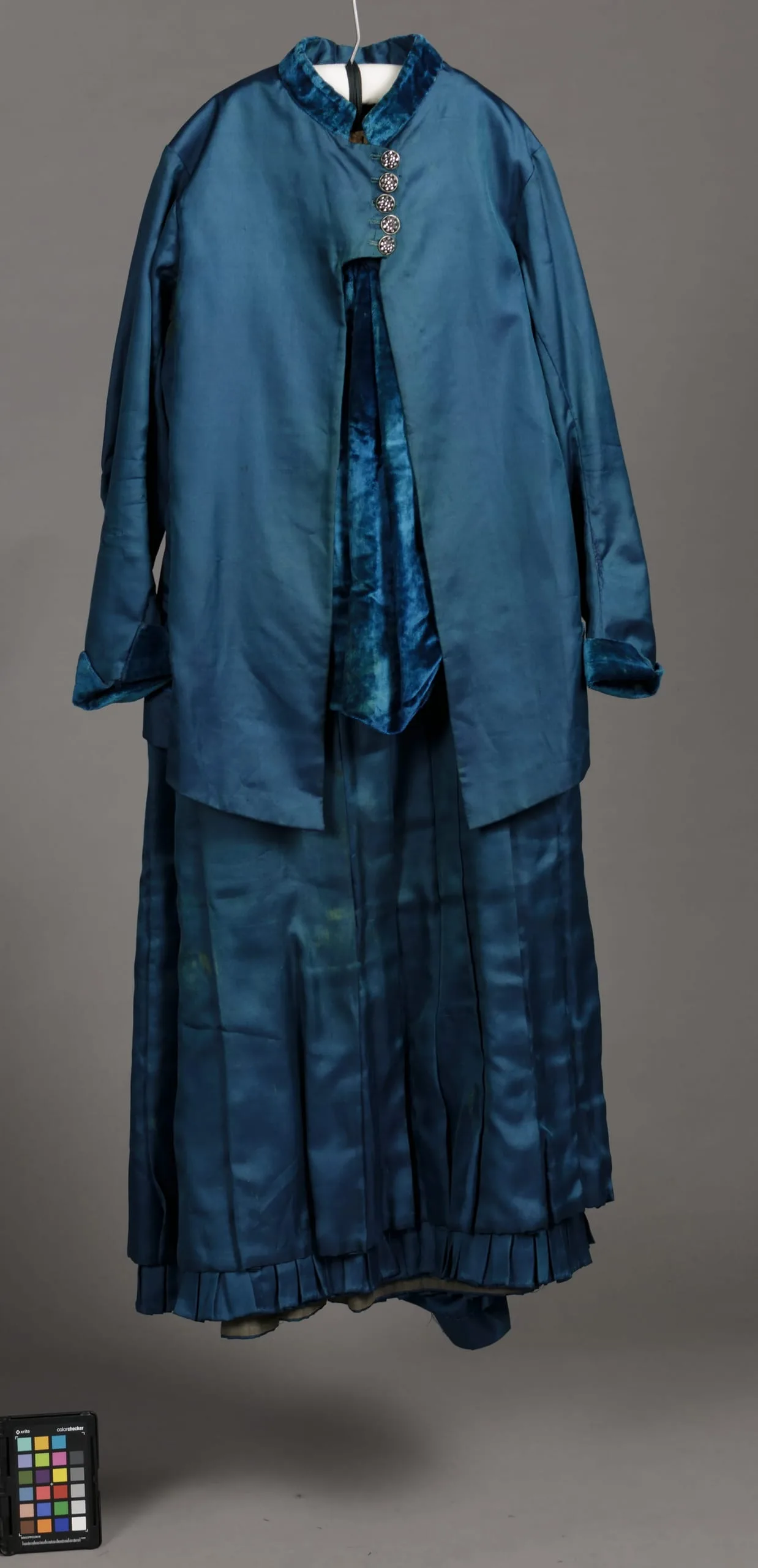 - Silk twill, silk velvet, and metal buttons (marquisite)