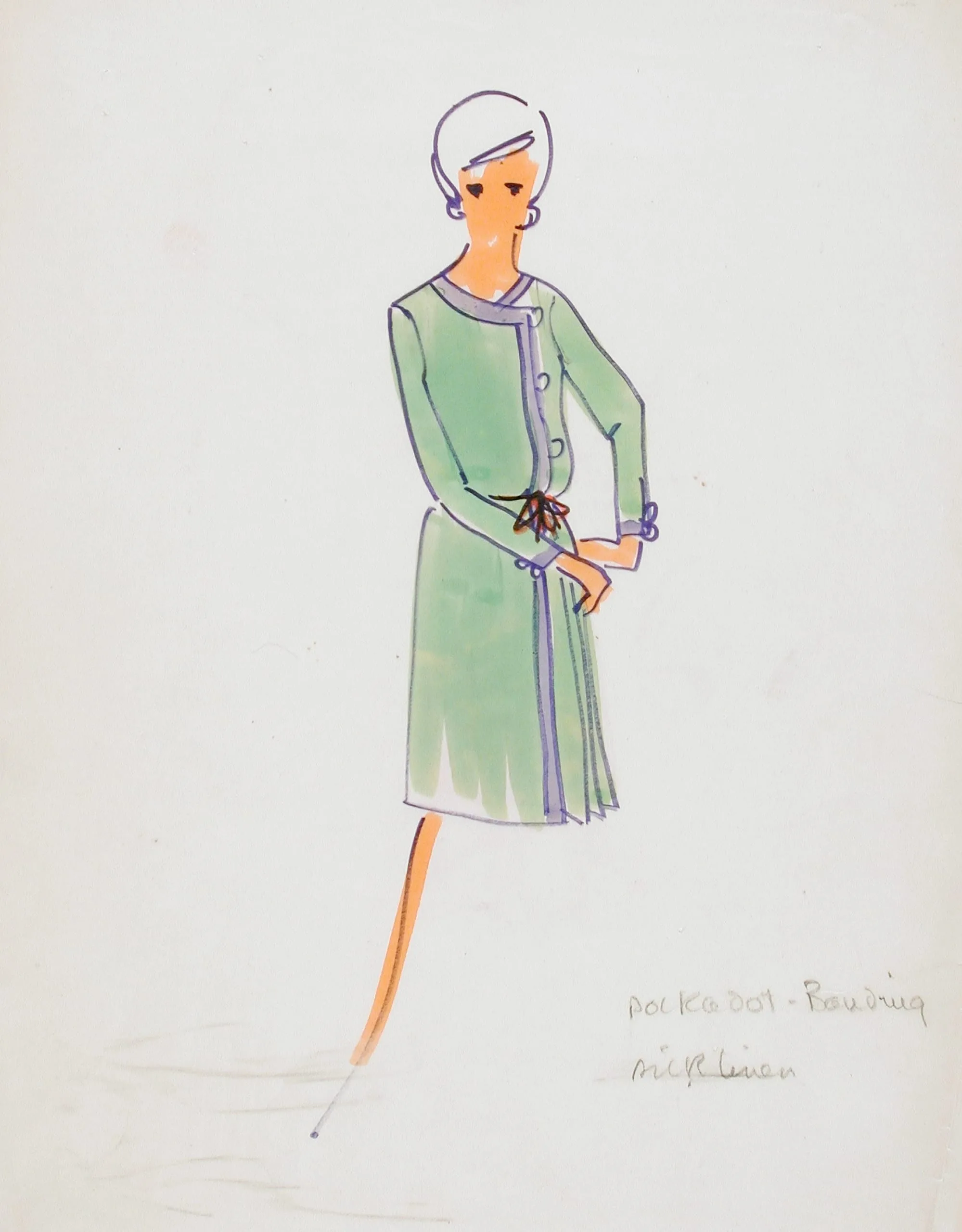 Fashion illustration in ink and watercolor, a stylized figure in a mint green coat dress with lavender trim and a burgundy bow at the waist, with handwritten annotations in the lower right
