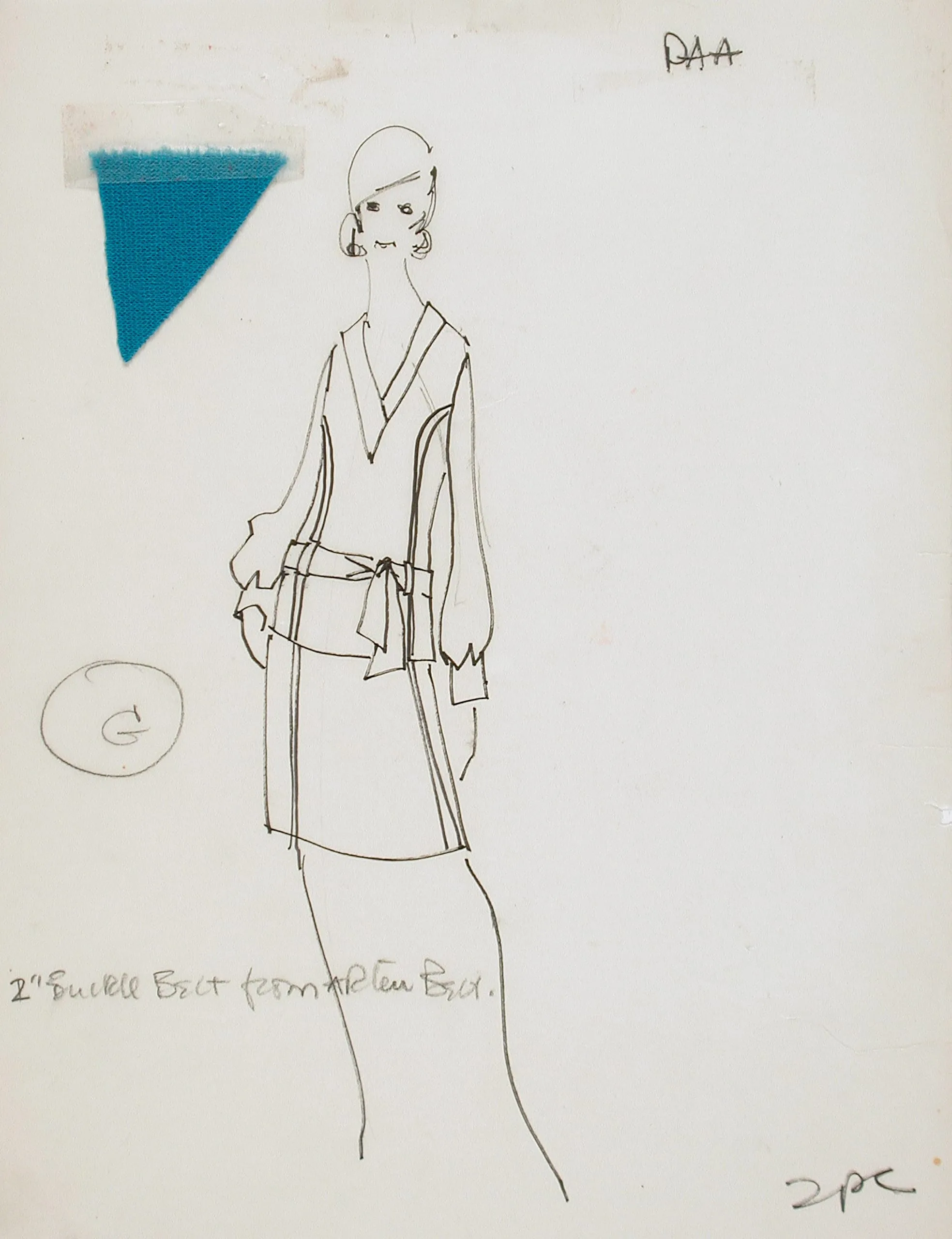 Ink fashion illustration on white paper of a standing female figure in a loose V-neck top with tie belt and straight skirt, with an attached teal fabric swatch and handwritten annotations