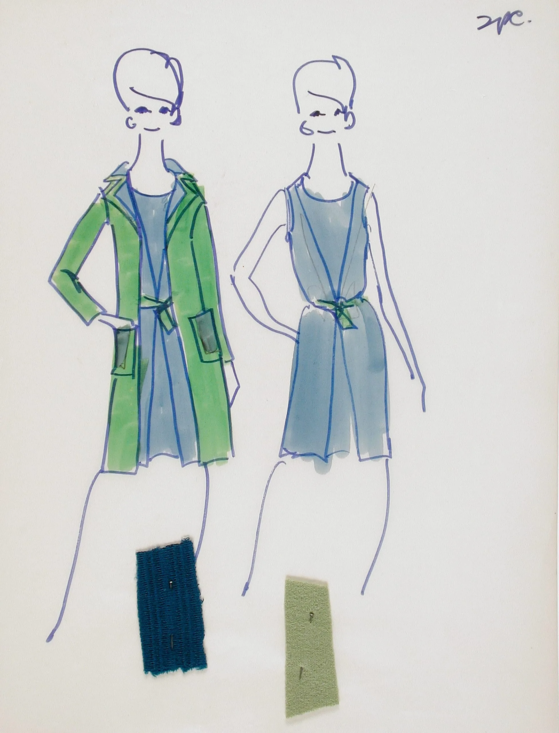 Fashion illustration in ink and color wash on white paper, two elongated female figures in a green coat and powder-blue dress, with two fabric swatches at bottom