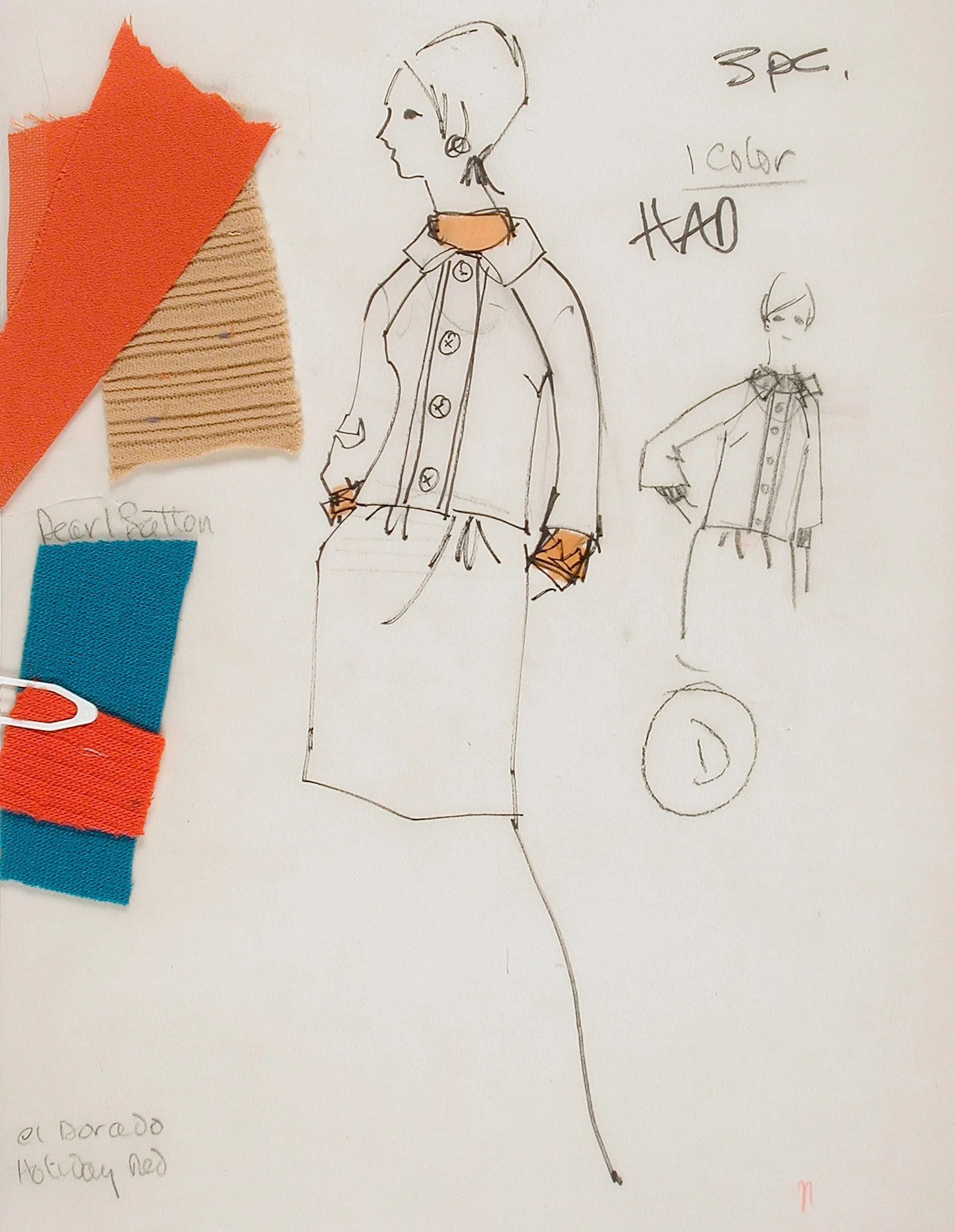 Fashion design drawing in black ink and orange on white paper, with fabric swatches in red, tan, and teal affixed to the left; central figure in profile wears a structured jacket and slim skirt