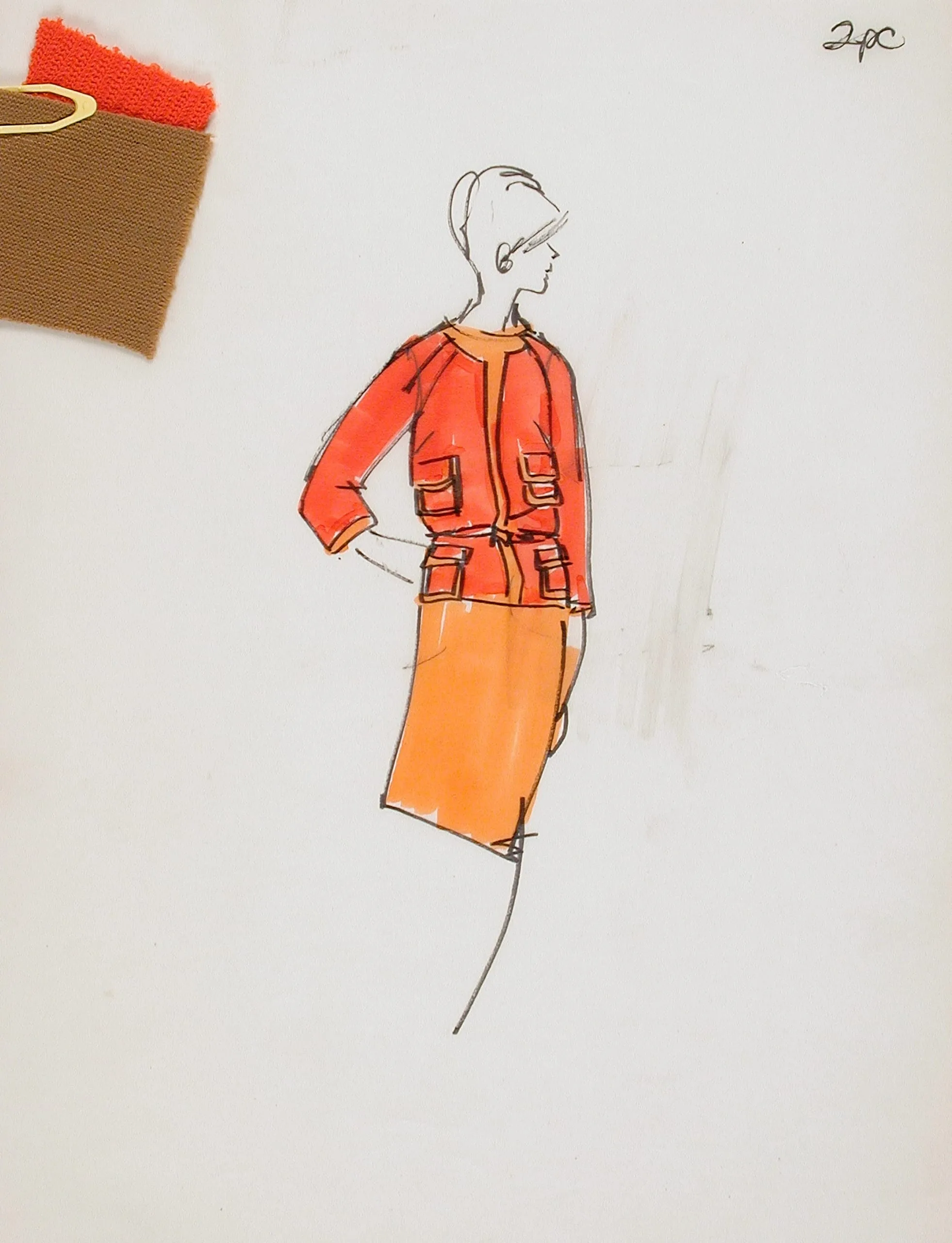 Fashion illustration in ink and color wash on white paper, showing a slender figure in profile wearing an orange-red belted jacket with patch pockets and a tangerine skirt, with fabric swatches attached upper left