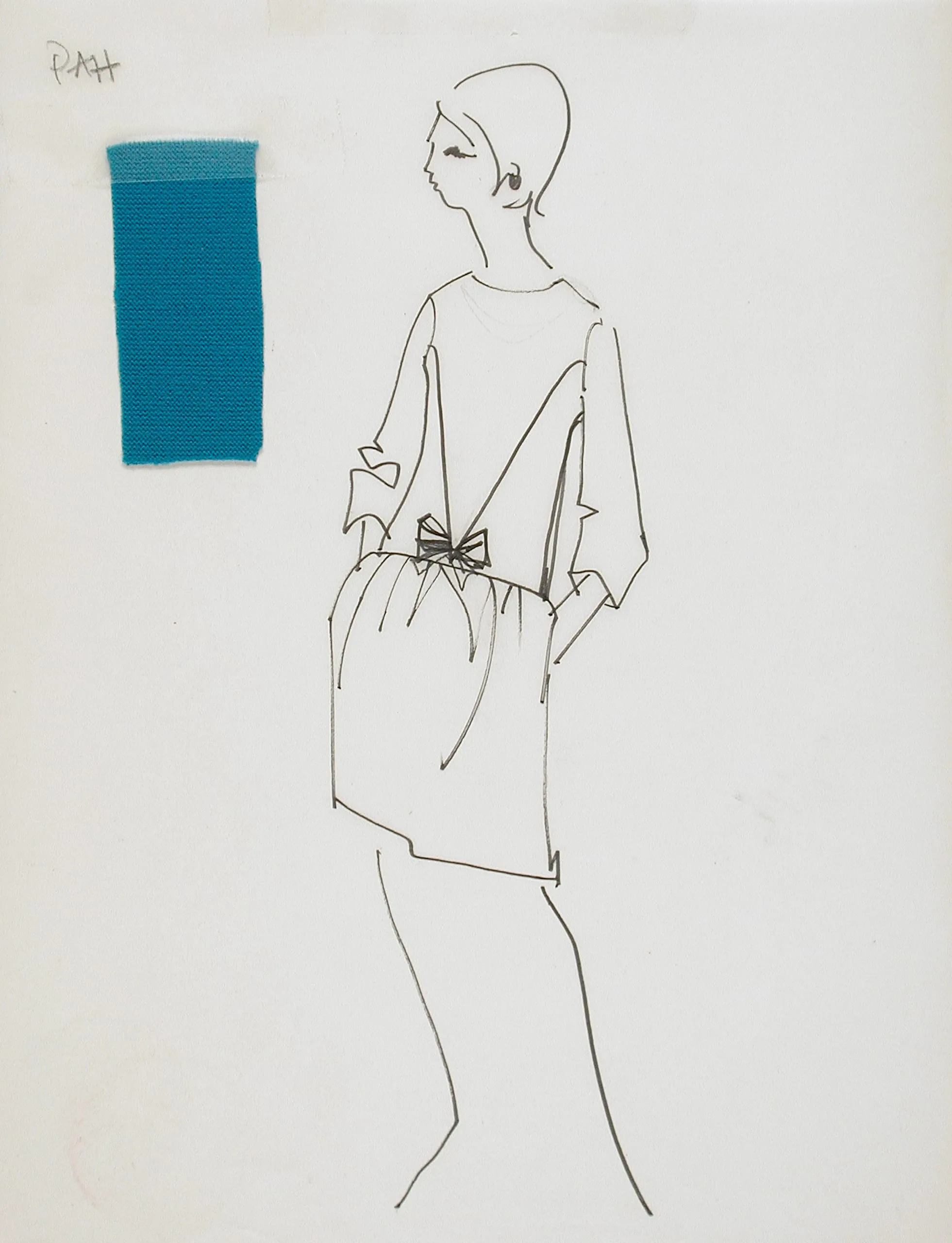 Fashion illustration in black ink on white paper, full-length profile figure in a loose belted tunic dress, with an attached teal fabric swatch