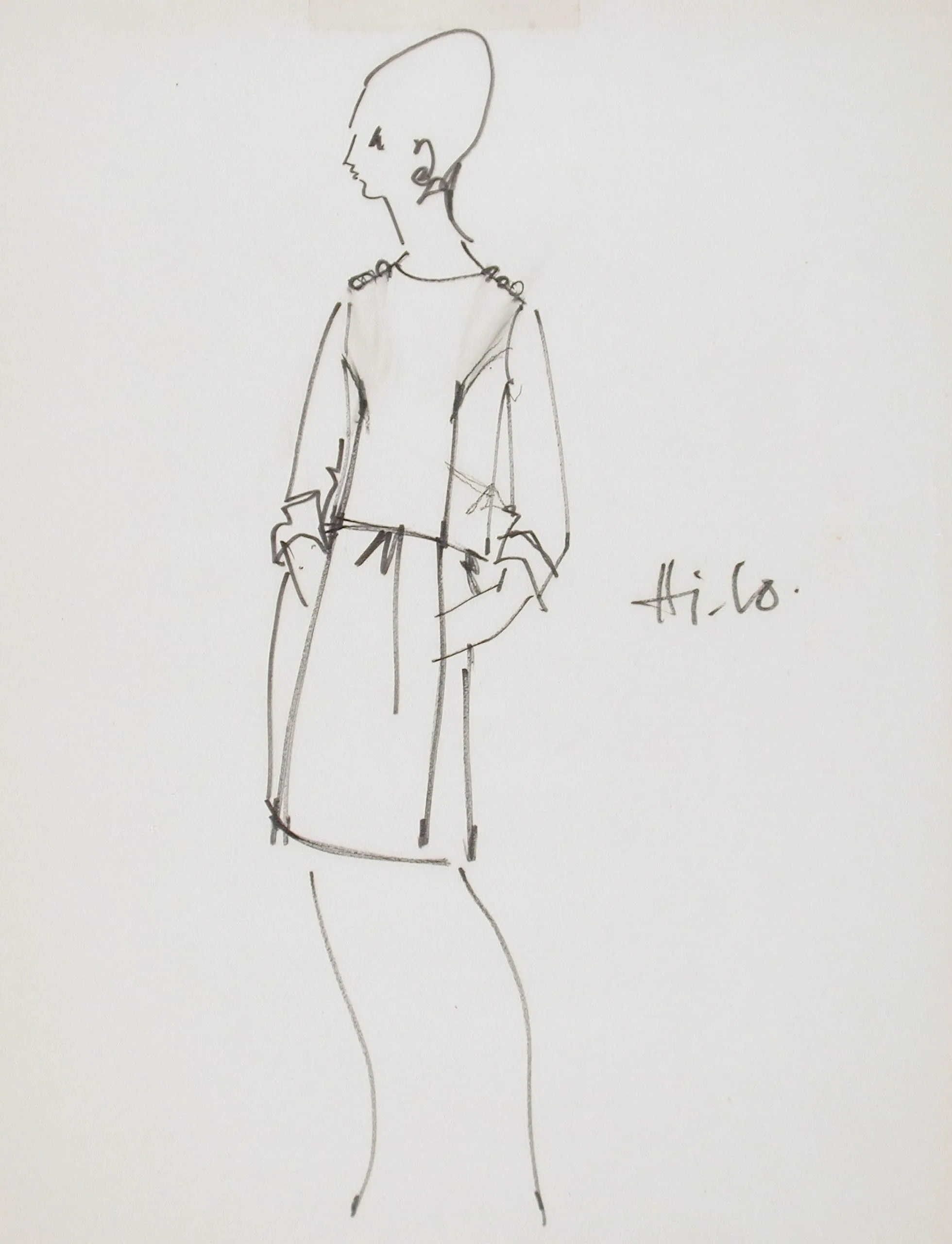 Fashion design sketch in black ink on off-white paper, full-length figure in profile wearing a knee-length dress with wide cuffs and belted waist, loose gestural line work