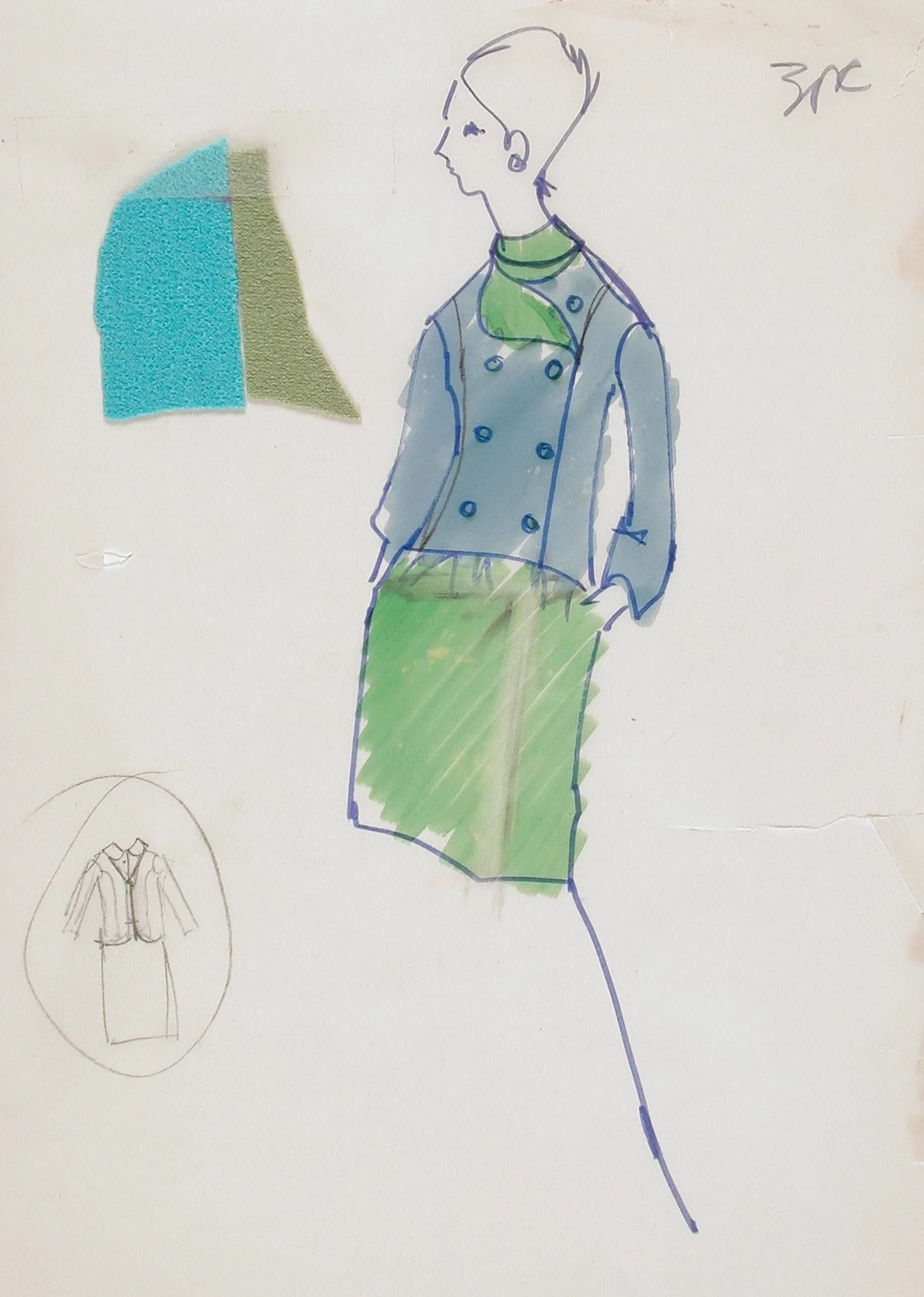 Fashion illustration in blue ink and watercolor on off-white paper, showing a stylized profile figure in a powder-blue double-breasted jacket and kelly-green skirt, with two fabric swatches affixed to the left