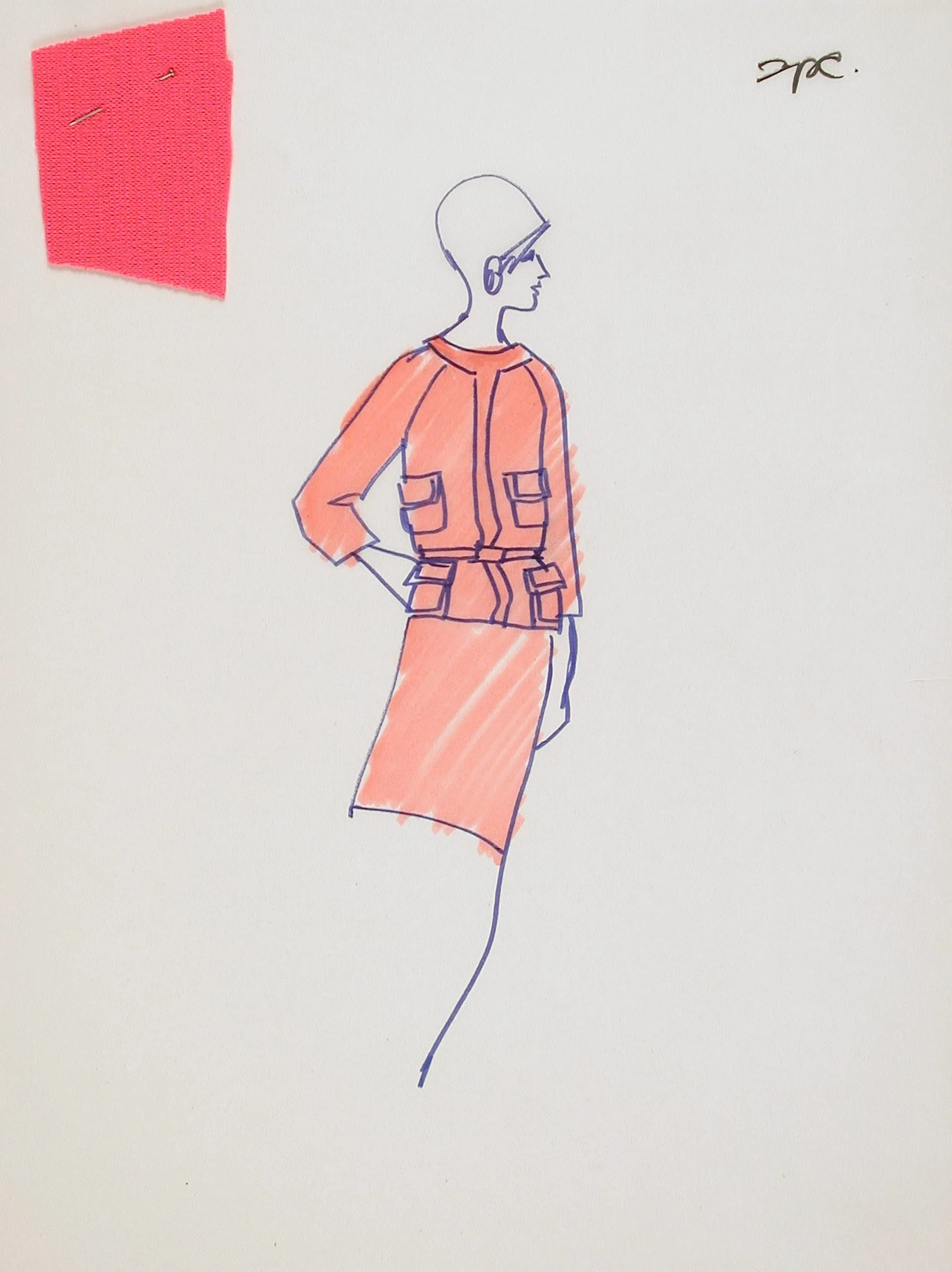 Fashion illustration in blue ink and coral-pink marker, full-length profile view of a stylized female figure wearing a belted jacket with patch pockets and a straight knee-length skirt, with a fabric swatch pinned to the upper left corner