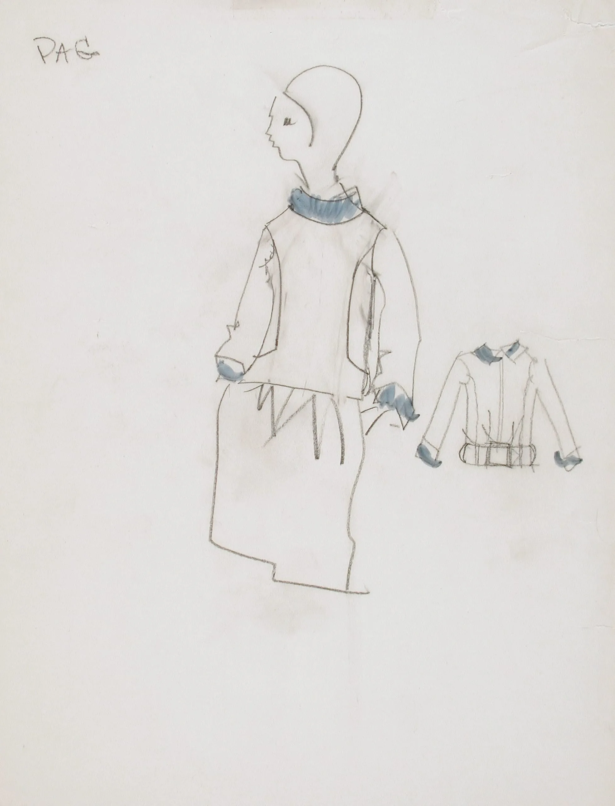Graphite and watercolor fashion drawing on off-white paper, stylized figure in a boxy top and skirt with blue collar and cuffs, smaller jacket sketch to the right