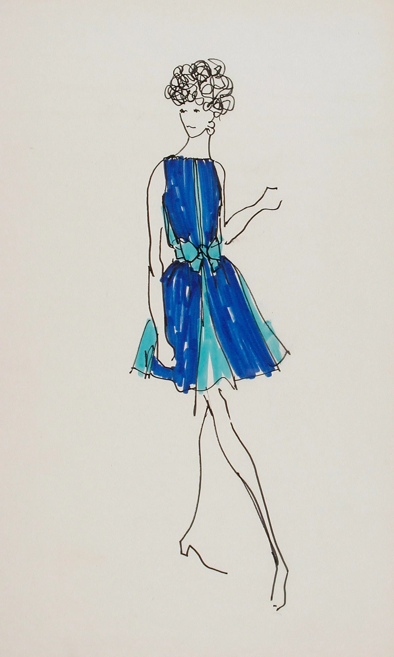 Fashion illustration in black ink and blue marker on off-white paper, full-length figure of a woman walking in a cobalt blue flared dress with an aquamarine bow at the waist