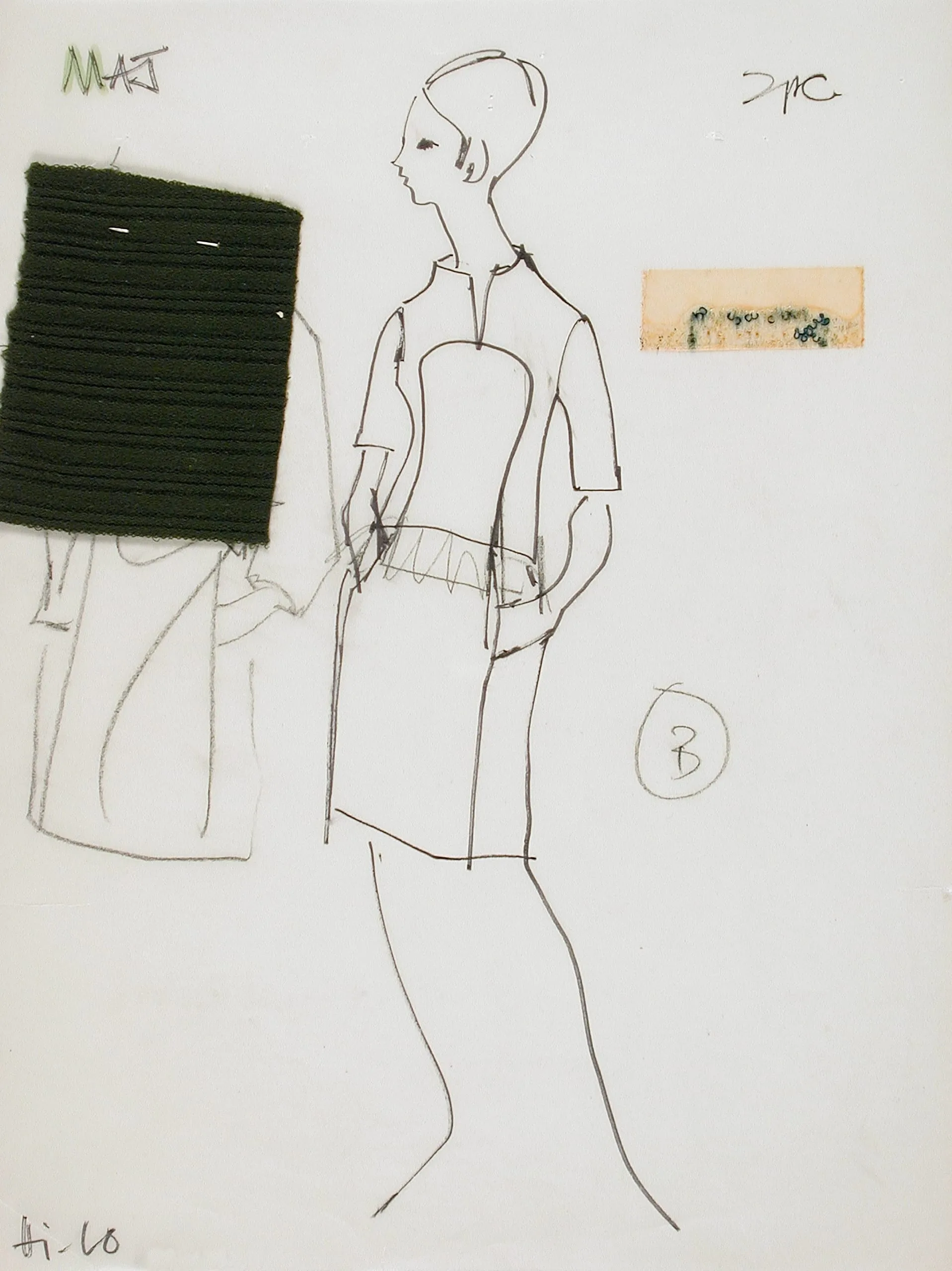 Fashion illustration in black ink on white paper, stylized female figure in a fitted short-sleeved dress shown in profile, with attached forest green fabric swatch and small printed textile sample