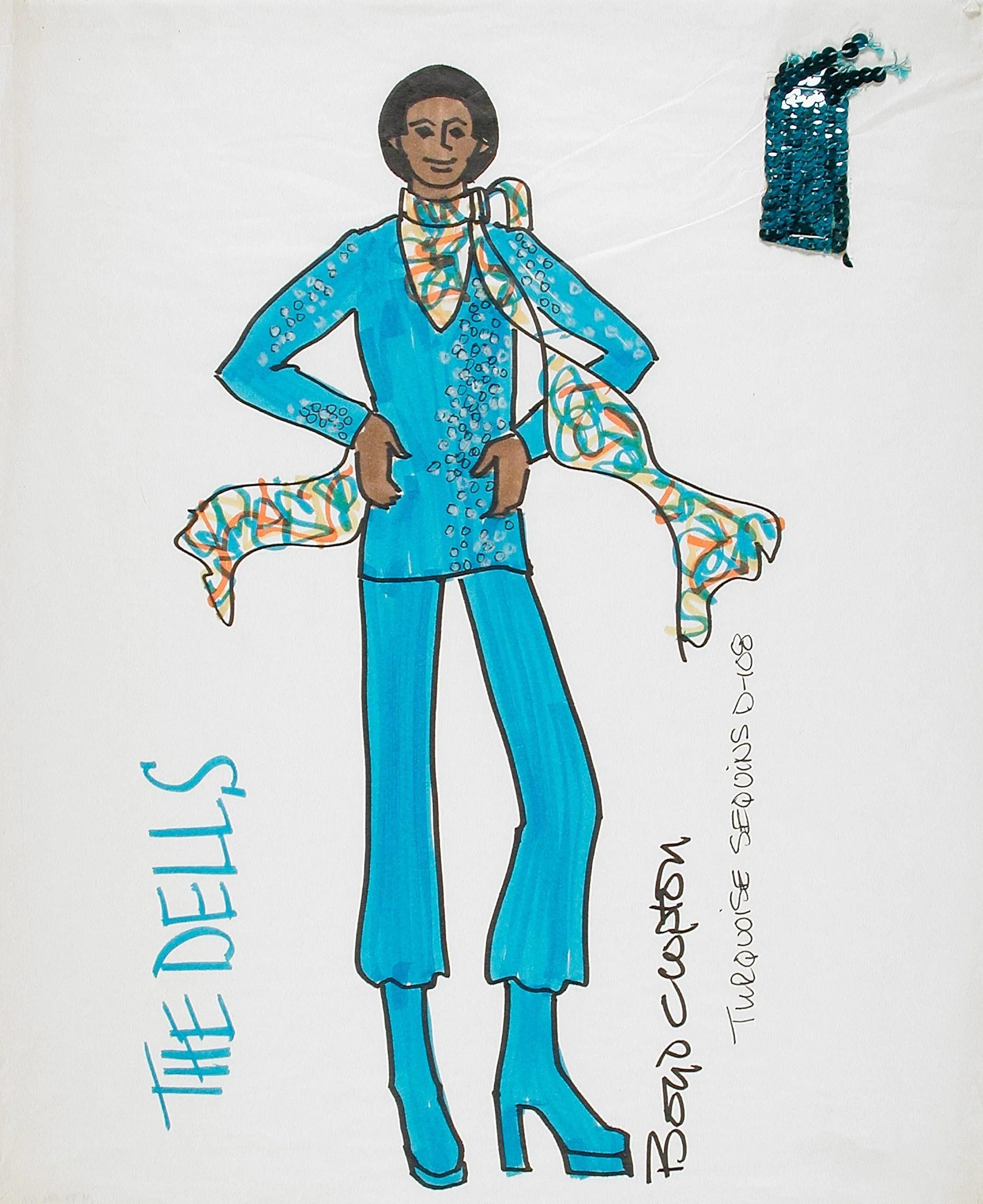 Costume design drawing in marker on paper, full-length figure in a turquoise sequined top, wide-leg trousers, and platform boots, with an attached teal sequined fabric swatch