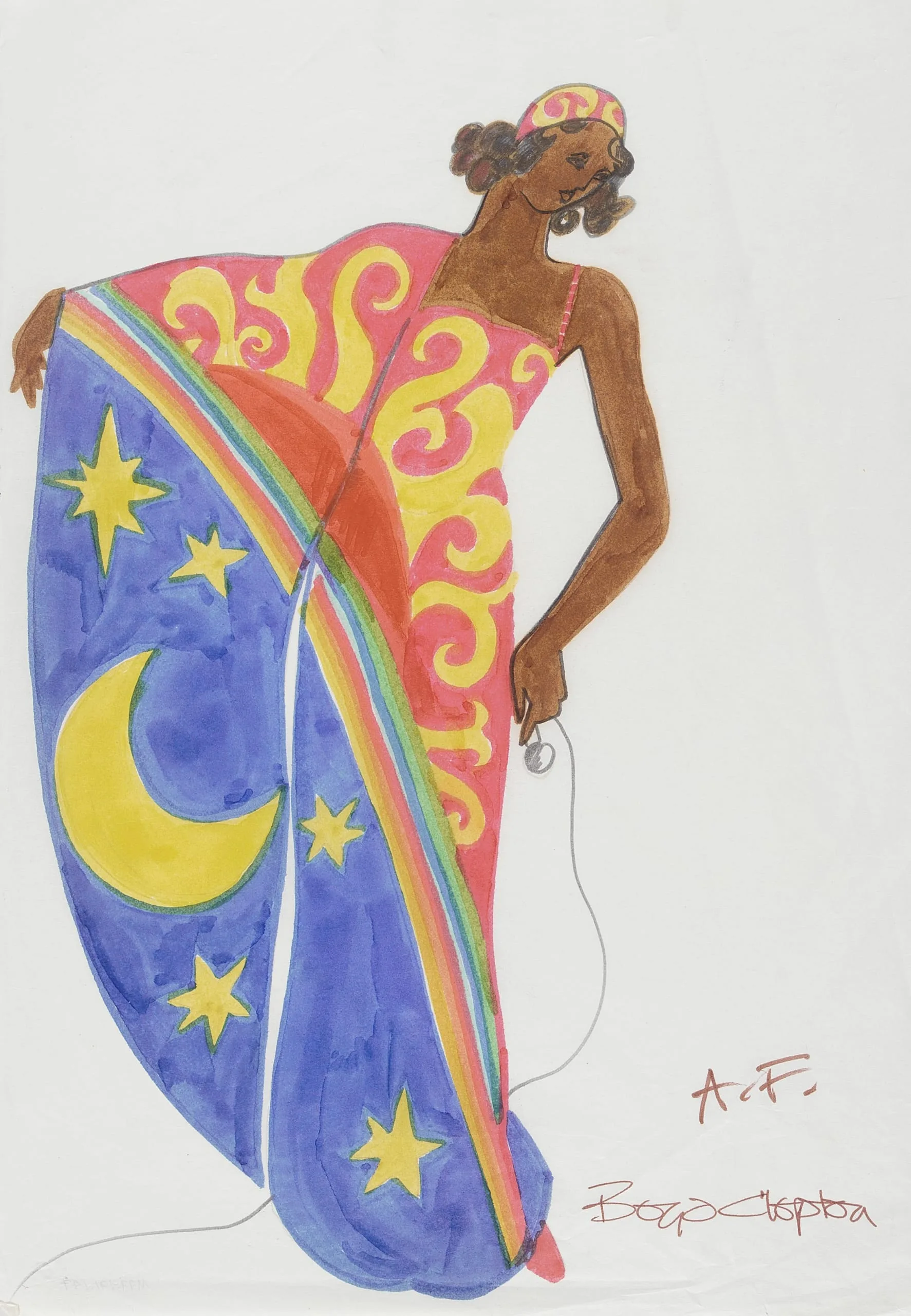 Watercolor and ink drawing of a full-length figure in a theatrical gown split between a pink section with yellow scrollwork and a cobalt blue section with yellow moon and stars, separated by a diagonal rainbow stripe