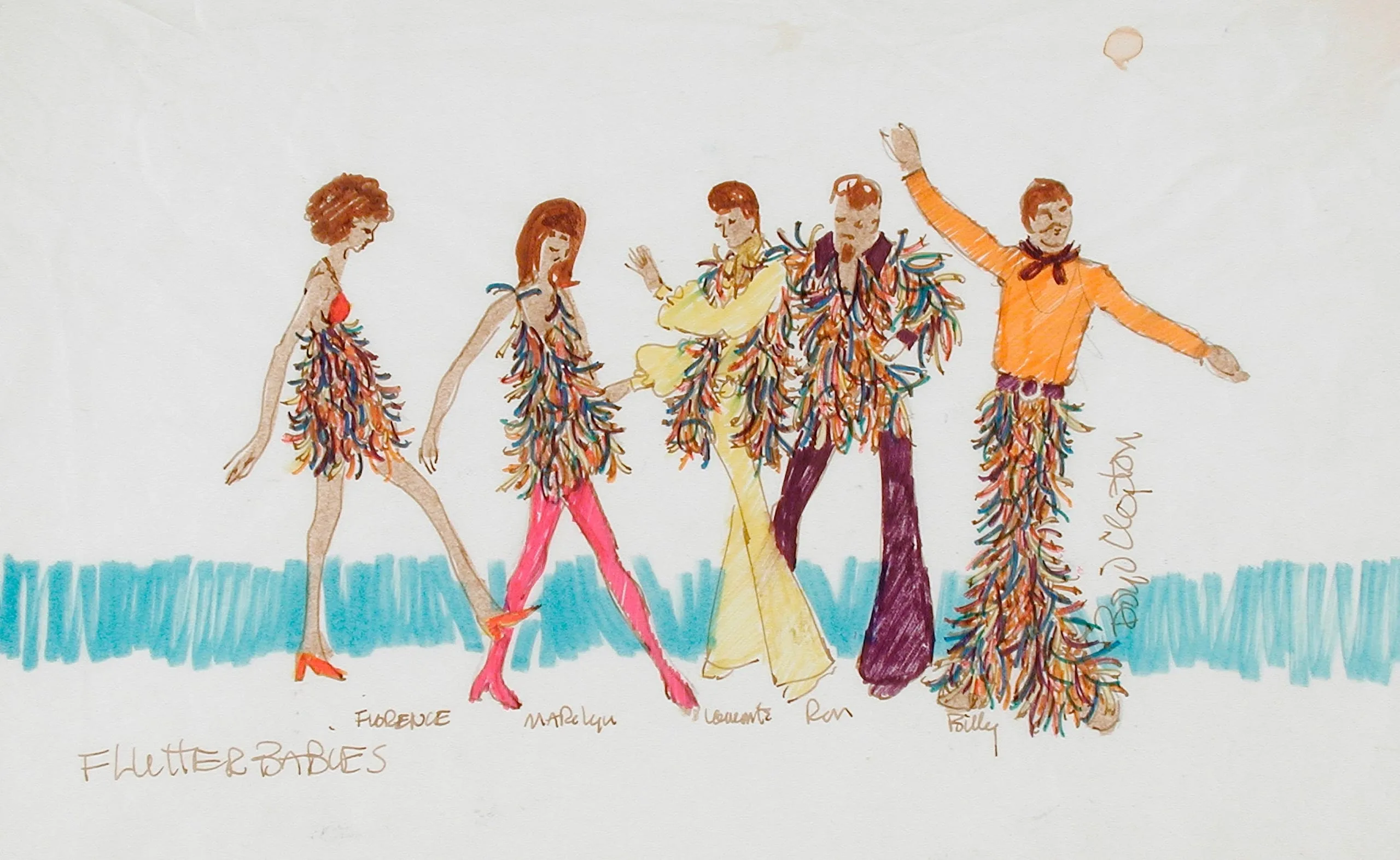 Colored pencil and ink costume design sketch showing five figures in multicolored fringed theatrical costumes, labeled 'Flutter Babies,' on white paper