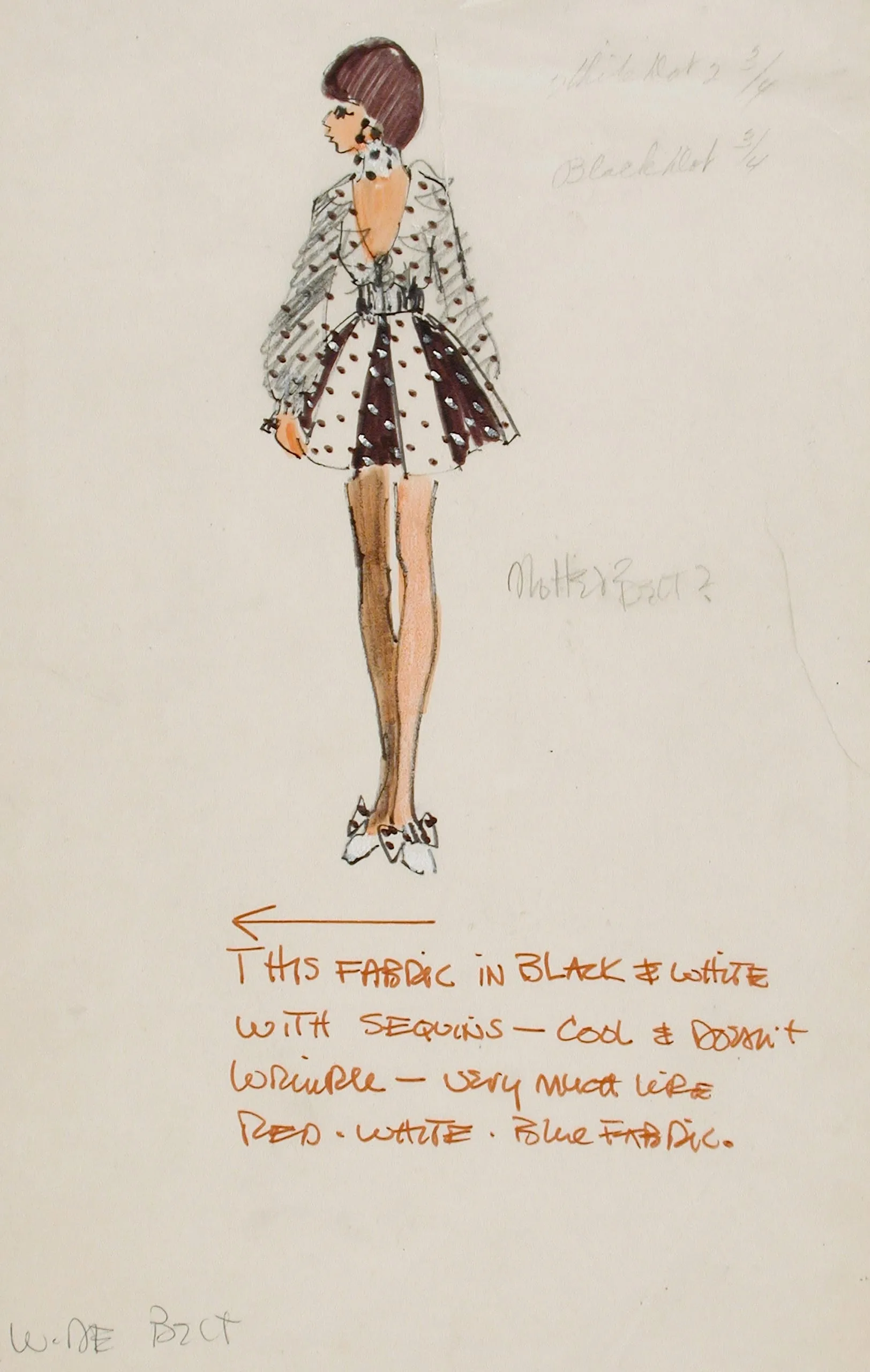 Fashion illustration in pencil and ink on cream paper, rear view of a woman in a polka-dotted, full-skirted short dress with long sleeves and a dark belt, with orange handwritten fabric notes below