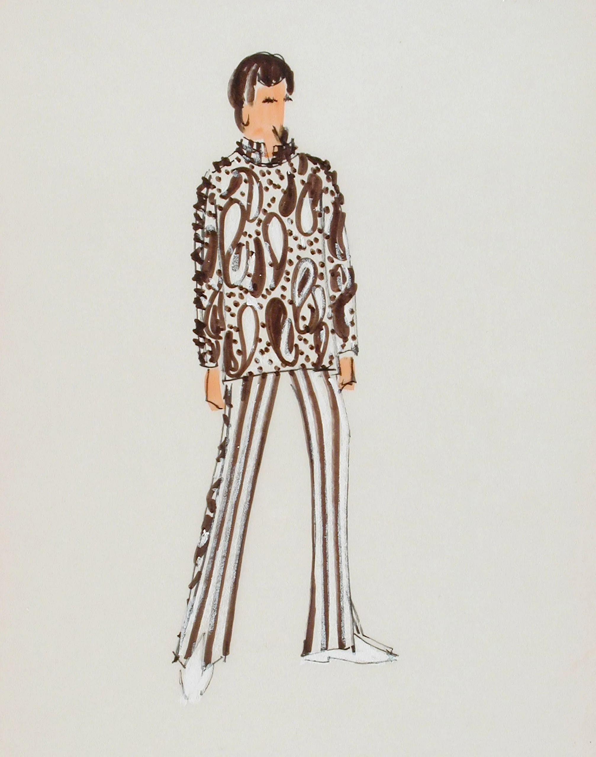 Ink and marker fashion illustration of a standing figure in a paisley-print tunic with ruffled trim and wide-leg striped trousers, rendered with loose brushwork on off-white paper