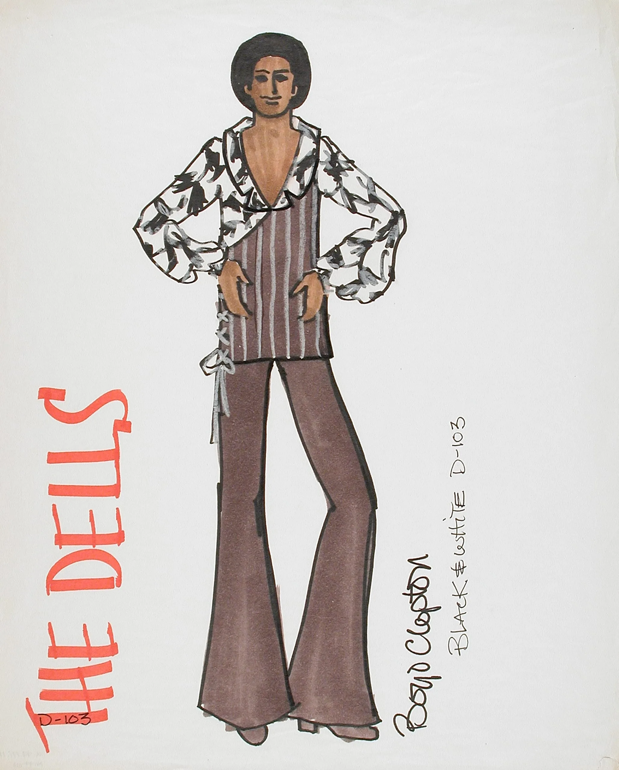 Ink and gouache costume design drawing, full-length male figure in flared trousers, patterned shirt, and striped vest, with handwritten annotations and bold red lettering