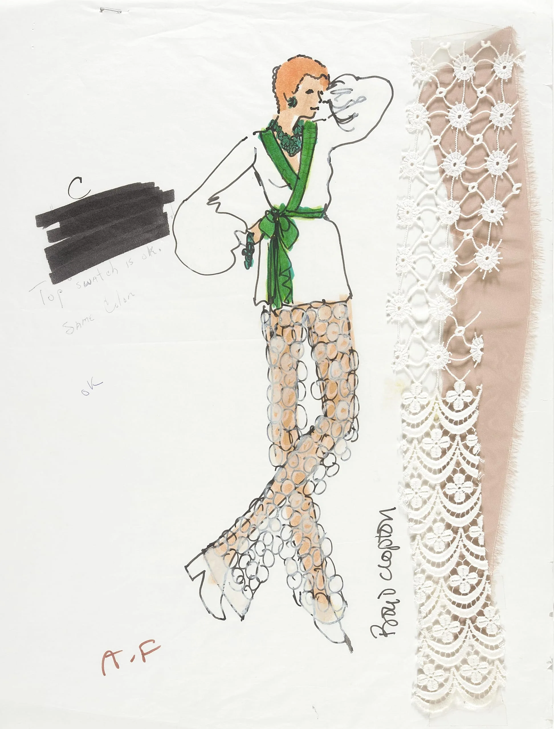 Fashion illustration in ink and color on white paper, showing a woman in a white wrap blouse, green sash, and circle-print wide-leg trousers, with an attached white lace and pink fabric swatch at right