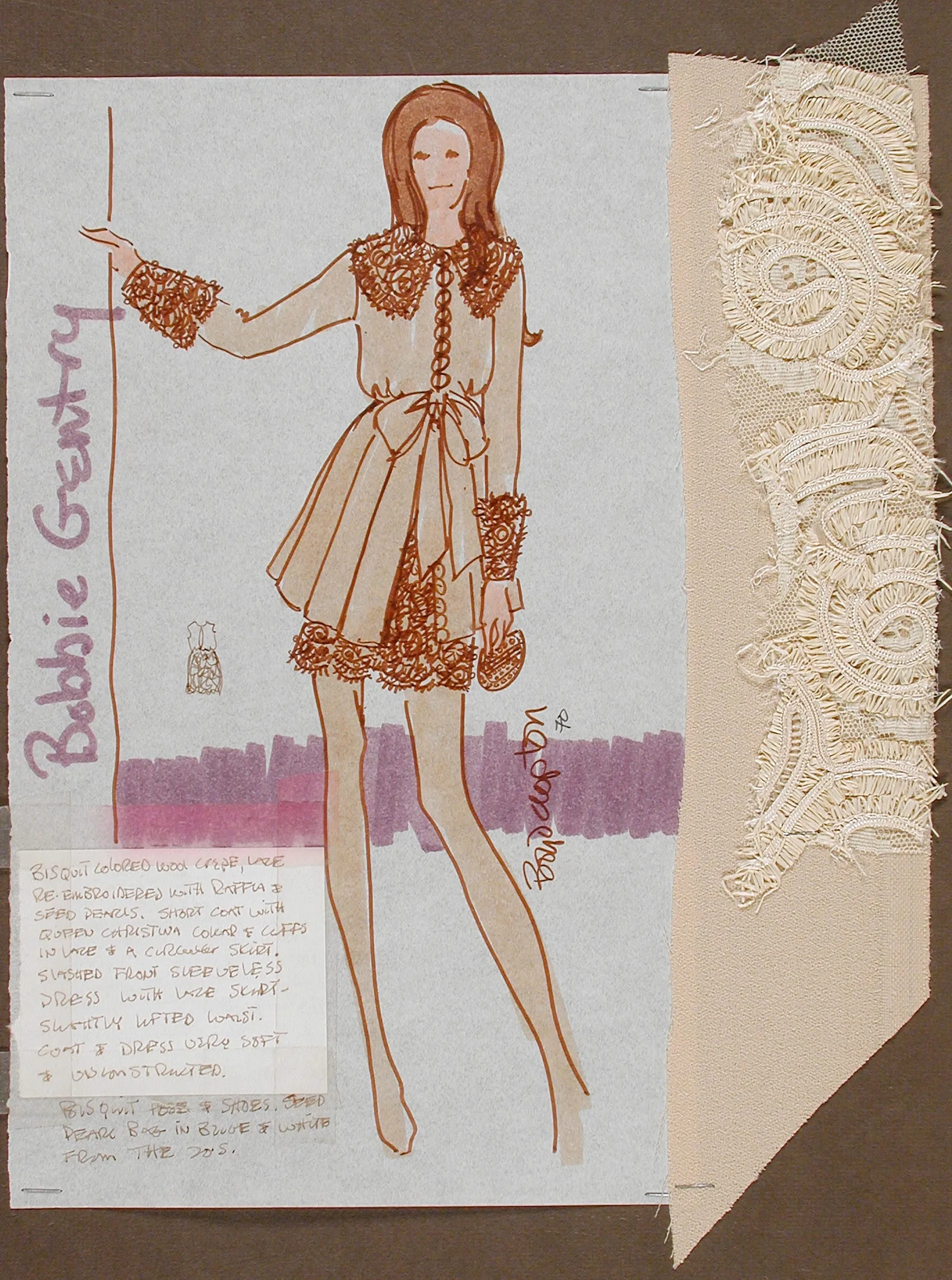 Fashion illustration in brown ink and tan wash on gray-blue paper, full-length figure in lace-trimmed coat and dress with handwritten notes and a fabric lace sample attached at right