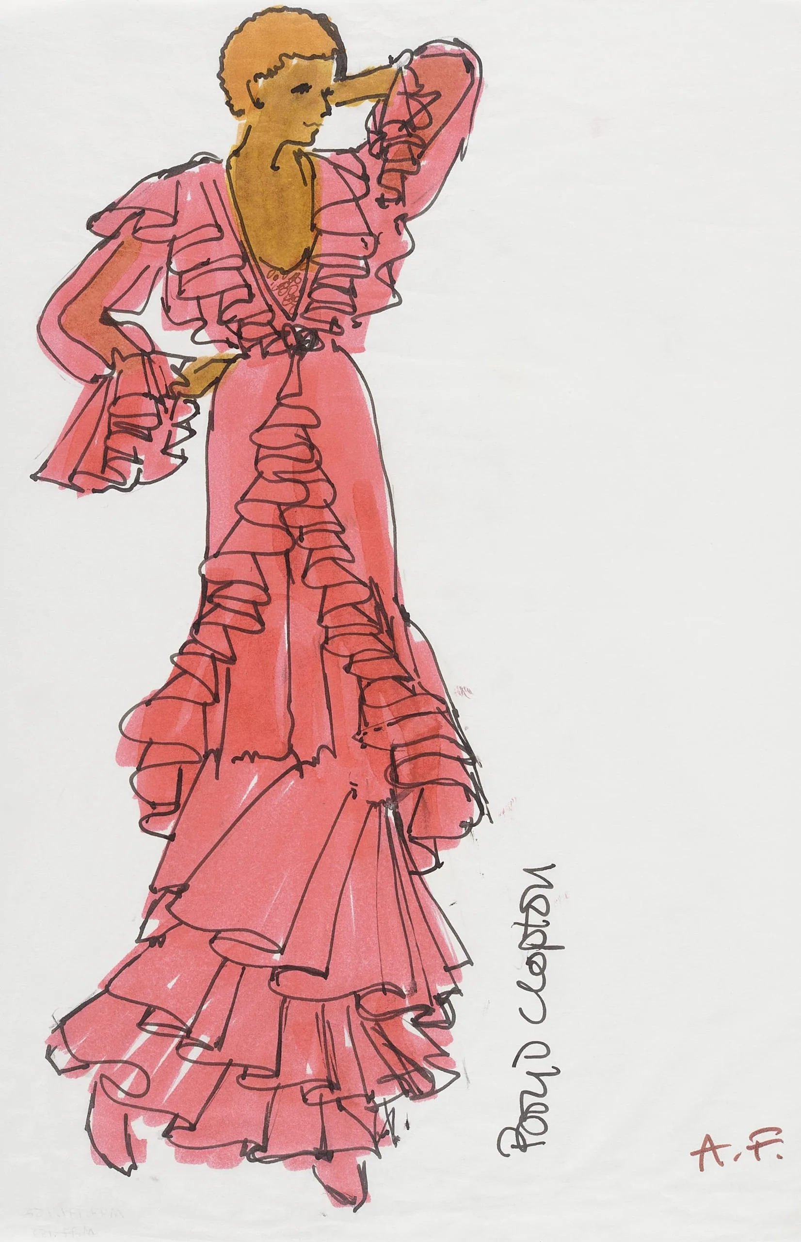 Fashion illustration in black ink and coral-pink wash on white paper, showing a figure in a ruffled floor-length gown with raised arm, gestural linework