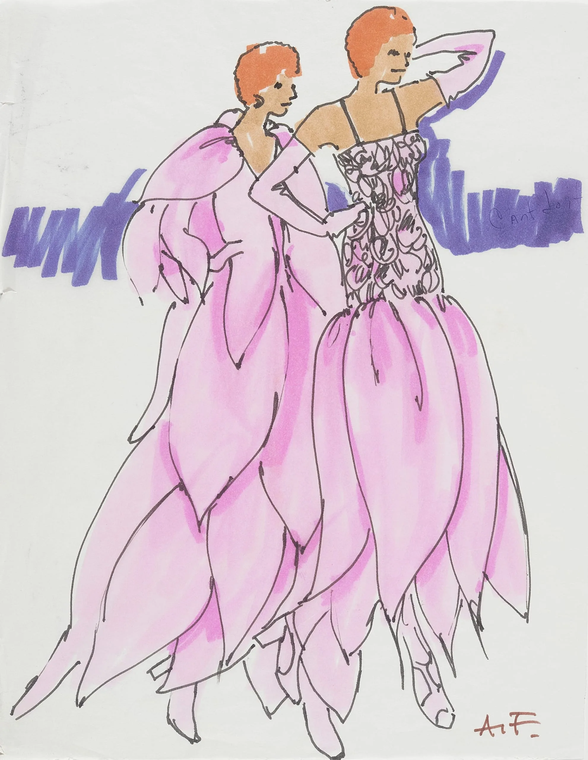 Fashion illustration in ink and pink wash showing two figures in voluminous petal-skirted gowns, one with a billowing cape, against loose violet-blue strokes