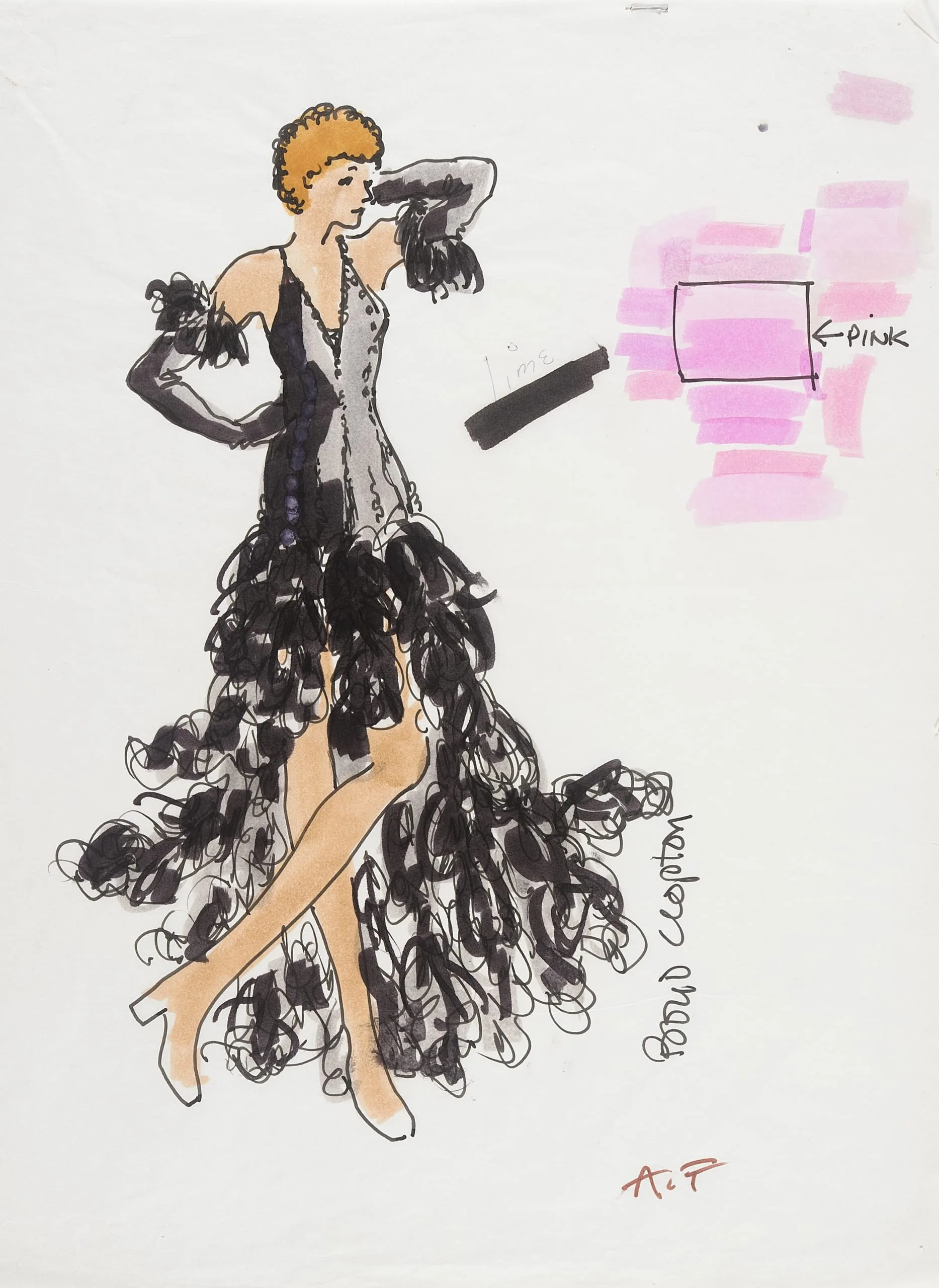 Ink and watercolor costume design sketch of a woman in a dramatic black feathered or ruffled gown with fitted bodice, long black gloves, and a pink color swatch with annotation in the upper right