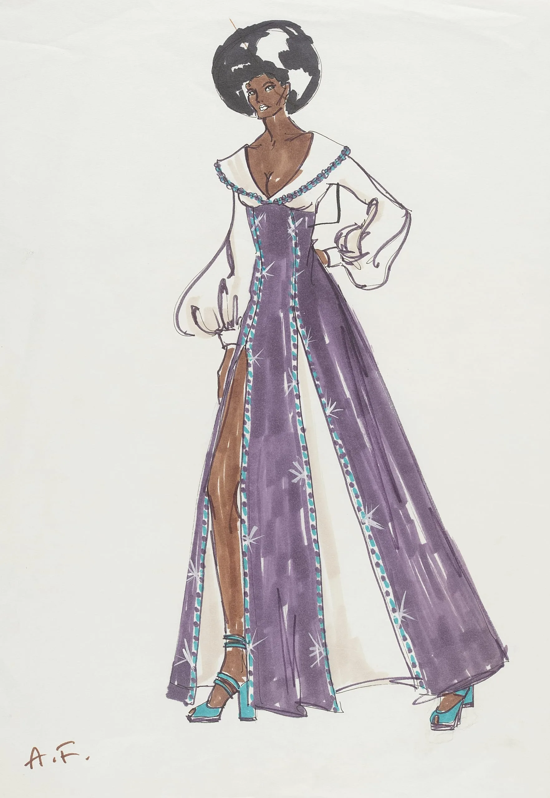 Fashion illustration in ink and wash on cream paper, full-length figure of a woman in a mauve floor-length gown with teal trim, white billowing sleeves, and platform sandals