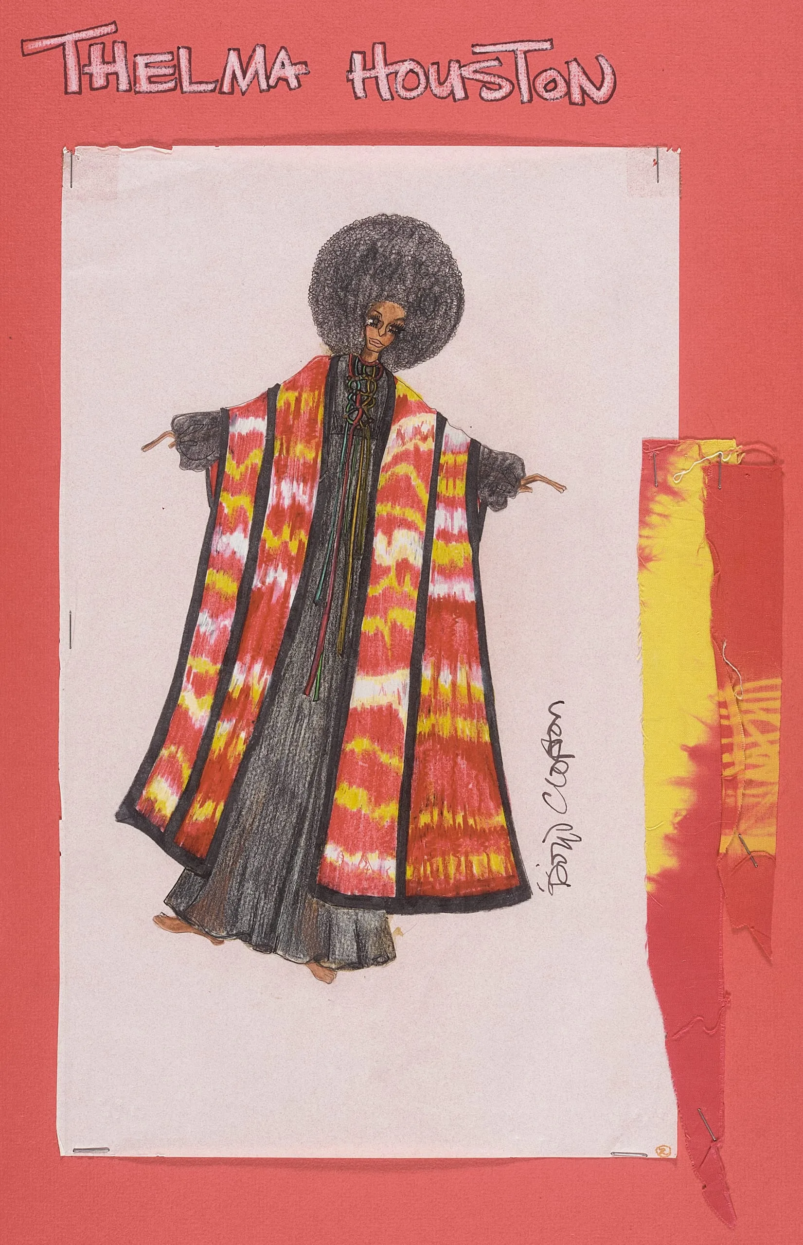 Costume design sketch in pencil and marker, full-length figure in a boldly patterned red, yellow, and white tie-dye robe with black borders, voluminous afro, and large sunglasses; collaged fabric swatch at right