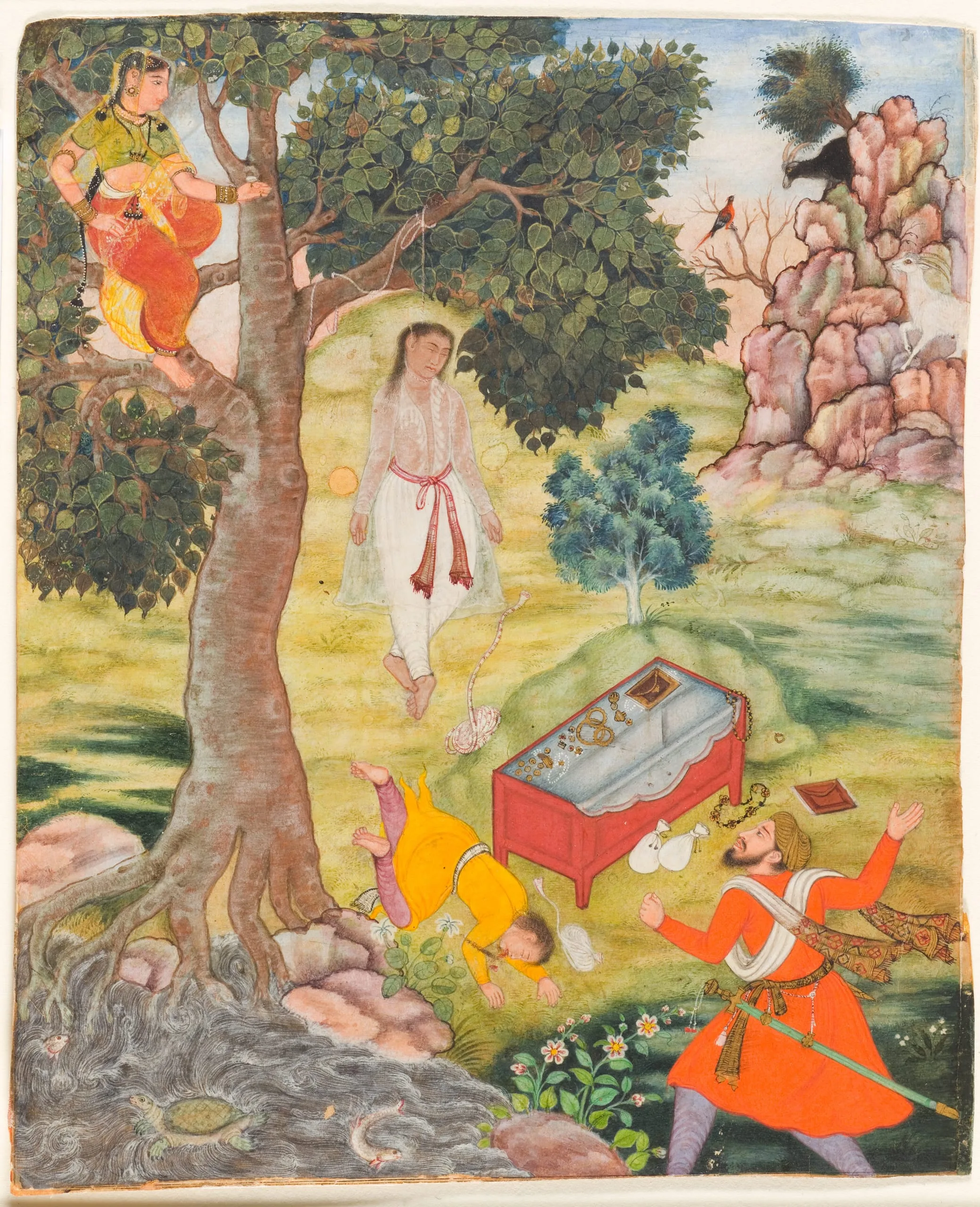 This folio depicts the story of the female ascetic disciple Siddhikari from “The Story of Devasmita” in Chapter 13 of the text. She enters the service of a merchant in the guise of a maid to steal his treasures. While fleeing, she meets a domba (a low caste man) who tries to rob her. Siddhikari pretends that she is running away from her husband and intends to commit suicide. She asks the domba how to hang herself, and as he shows her, she kicks away the (undepicted) drum on which he stands. While the man hangs from the tree, the merchant arrives with a servant. She climbs up in the tree, but the servant follows her. She pretends to kiss him and bites off his tongue. He falls from the tree before the dismayed merchant.