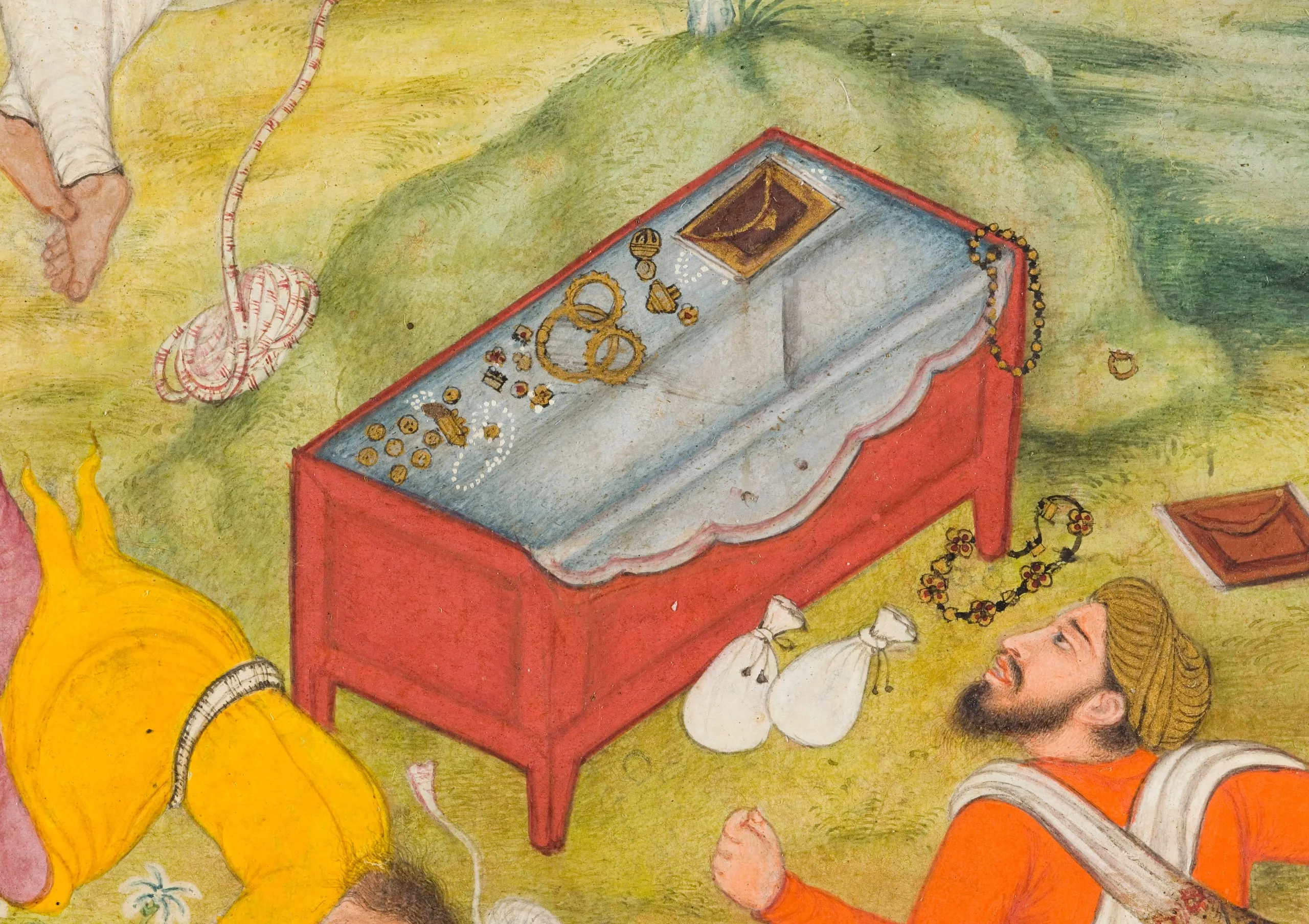 The Kathasaritsagara (Ocean of the Streams of Stories) is a vast anthology of hundreds of folk stories and fairy tales compiled in Sanskrit by the Kashmiri poet Somadeva in 1063–1081. Derived from earlier literary sources, the embellished tales were told by Somadeva for the diversion of Suryamati (or Suryavati), the queen of King Ananta of Kashmir (r. 1028–1063). The text was translated into Persian by Mustafa Khaliqdad ‘Abbasi for the Mughal Emperor Akbar (r. 1556–1605), but only about a dozen illustrated leaves are extant. See also M.78.9.13, M.78.9.7, two folios in the San Diego Museum of Art (1990.280 and 1990.281), and one folio in the Cleveland Museum of Art (I-2013-7592/31). The known leaves are cropped and have the Persian text on the reverse.