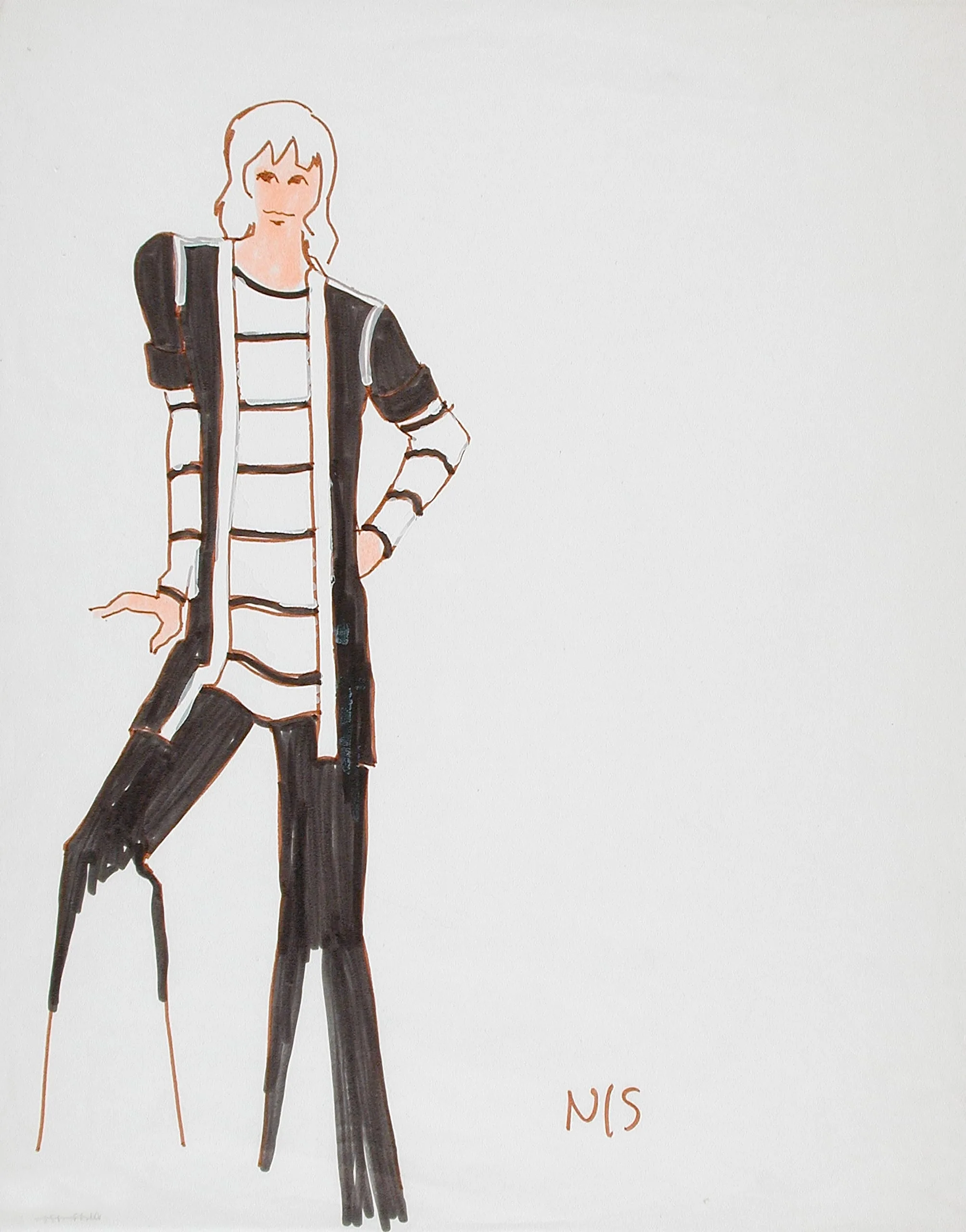 Fashion illustration in rust ink and black gouache on white paper, full-length standing figure in striped top, black vest, and slim trousers, loosely rendered with gestural strokes