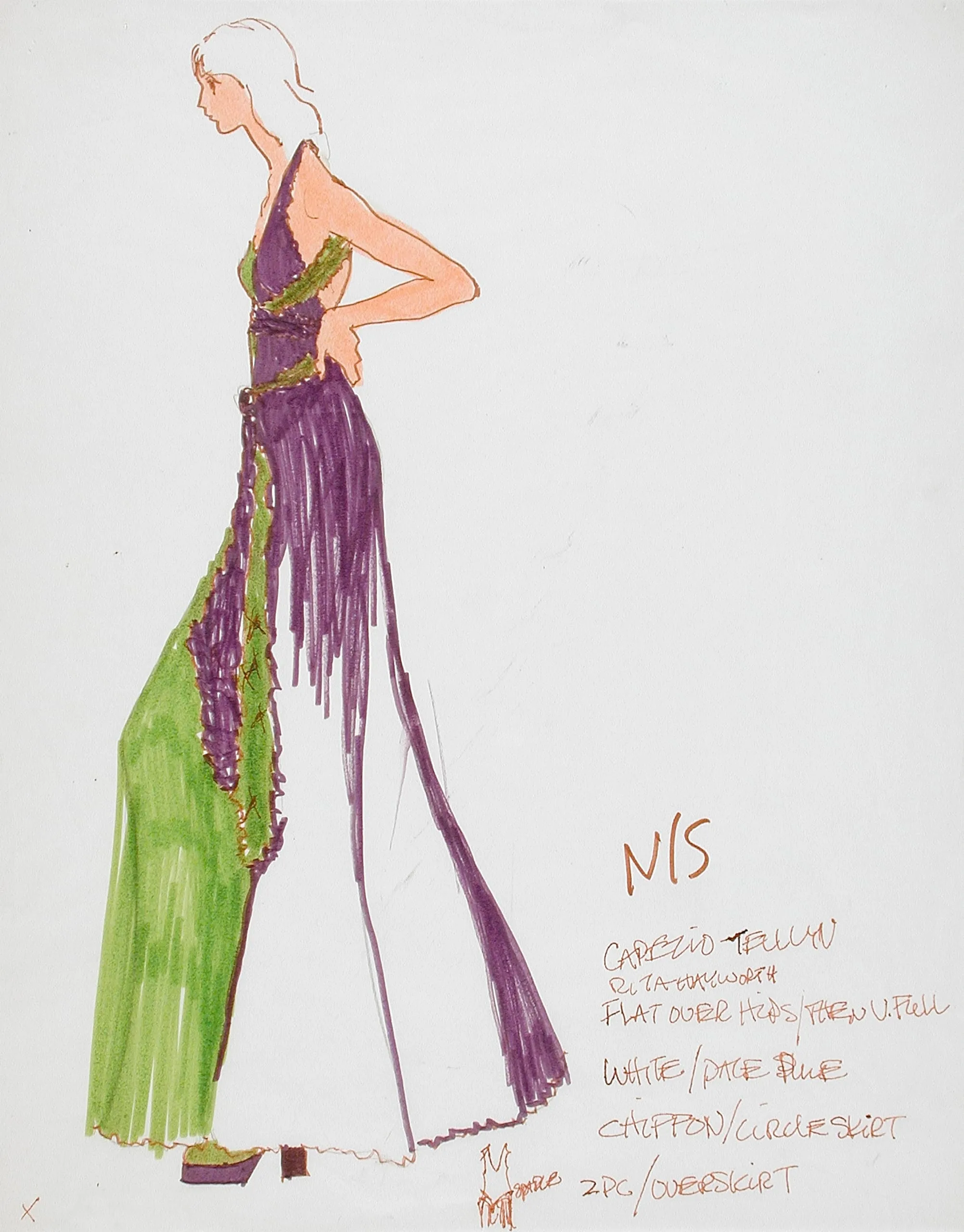 Fashion illustration in marker and ink on white paper, full-length female figure in profile wearing a purple fringed halter and green overskirt, with handwritten costume notes to the right