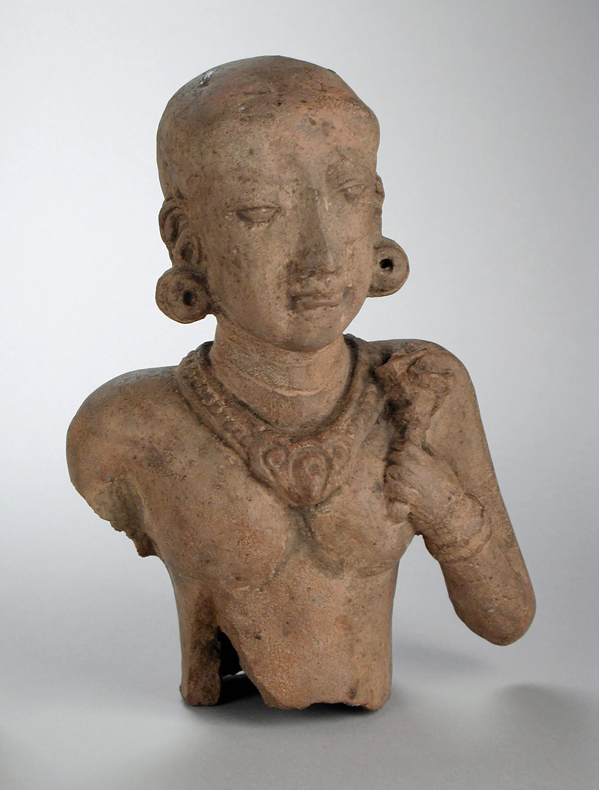 This young woman wears a large necklace, hoop earrings, and bracelets. In her left hand at shoulder level she holds what may be a ritual implement.