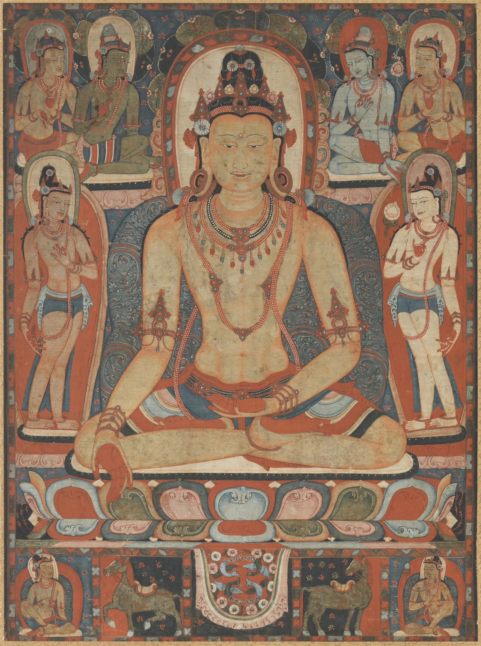 This painting of Ratnasambhava was once part of a set of five Jina (Meditation) Buddhas associated with Saravid (Universal Knowledge [of incantations and mantras] Vairochana (see AC1994.121.1). Each one of these Buddhas is associated with a color, direction, hand gesture, and vehicle. Ratnasambhava, who symbolizes the "primordial wisdom of equality," is yellow, presides over the southern quadrant, makes the gesture of charity (varada mudra), and has a horse mount (shown here in the bottom register). Ratnasambhava is enthroned on a lotus base in the center of the painting. He is flanked by the Bodhisattvas Vajra Ratna on his right and Vajra Hasa on his left. The green and blue Bodhisattvas flanking Ratnasambhava’s head are Vajra Tejas and Vajra Ketu respectively. In the four corners are yellow Bodhisattvas displaying the gesture of discourse (vitarka mudra).