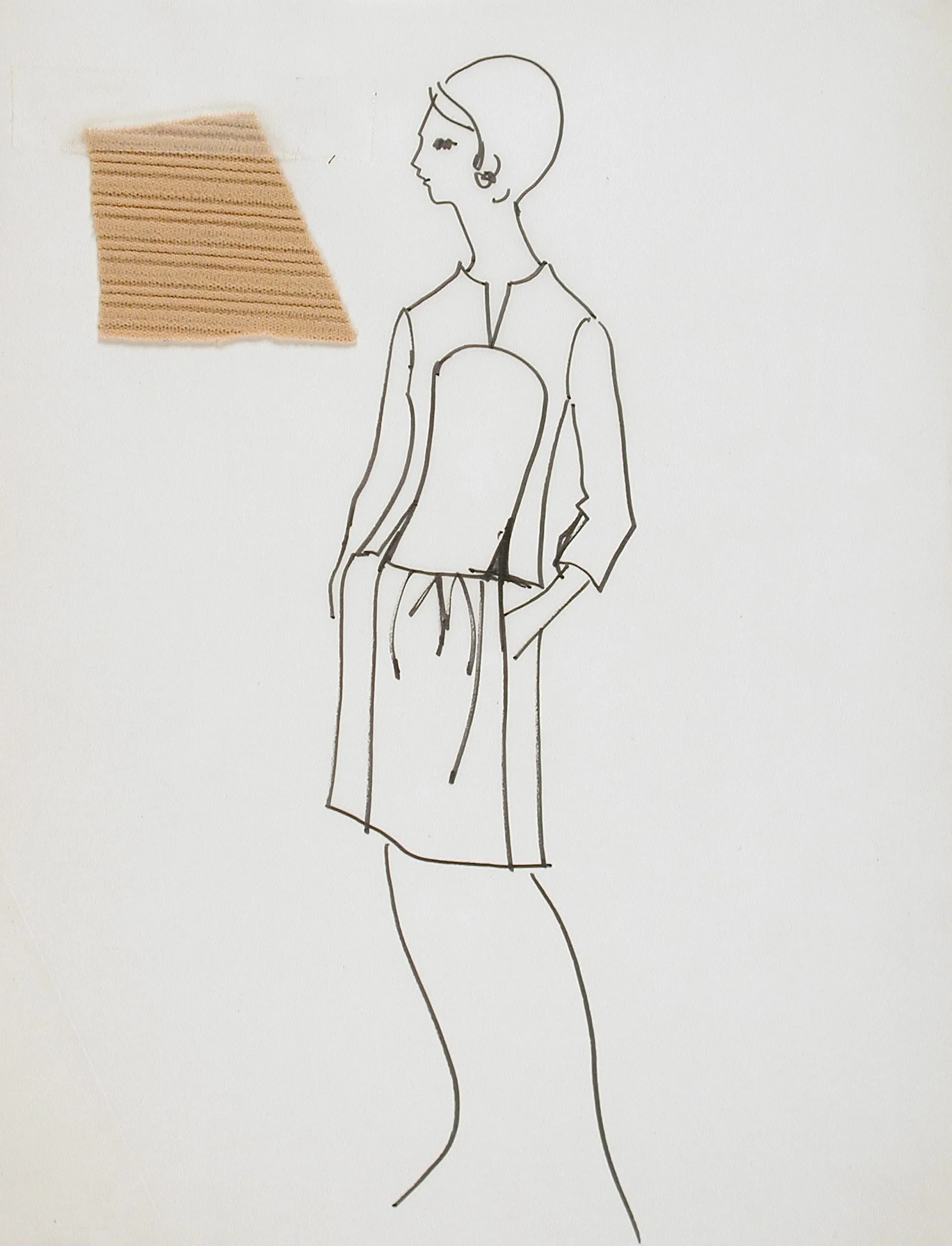 Fashion illustration in black ink on white paper, profile view of a stylized figure in a belted tunic dress, with an attached ribbed camel-colored fabric swatch in the upper left