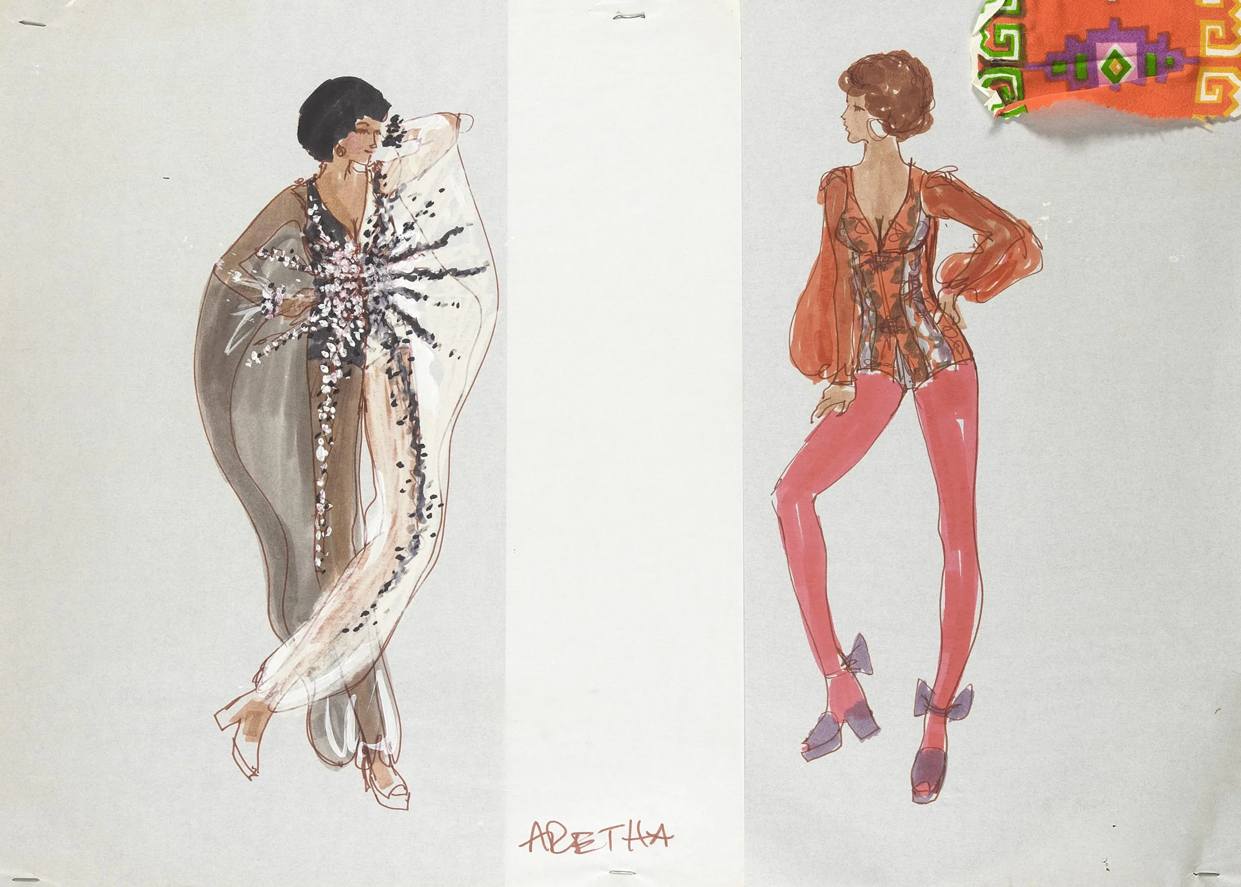 Ink and watercolor fashion illustration on two sheets of paper showing two full-length female figures in stage costumes, with the name 'ARETHA' written in red below the left figure and a fabric swatch in the upper right corner