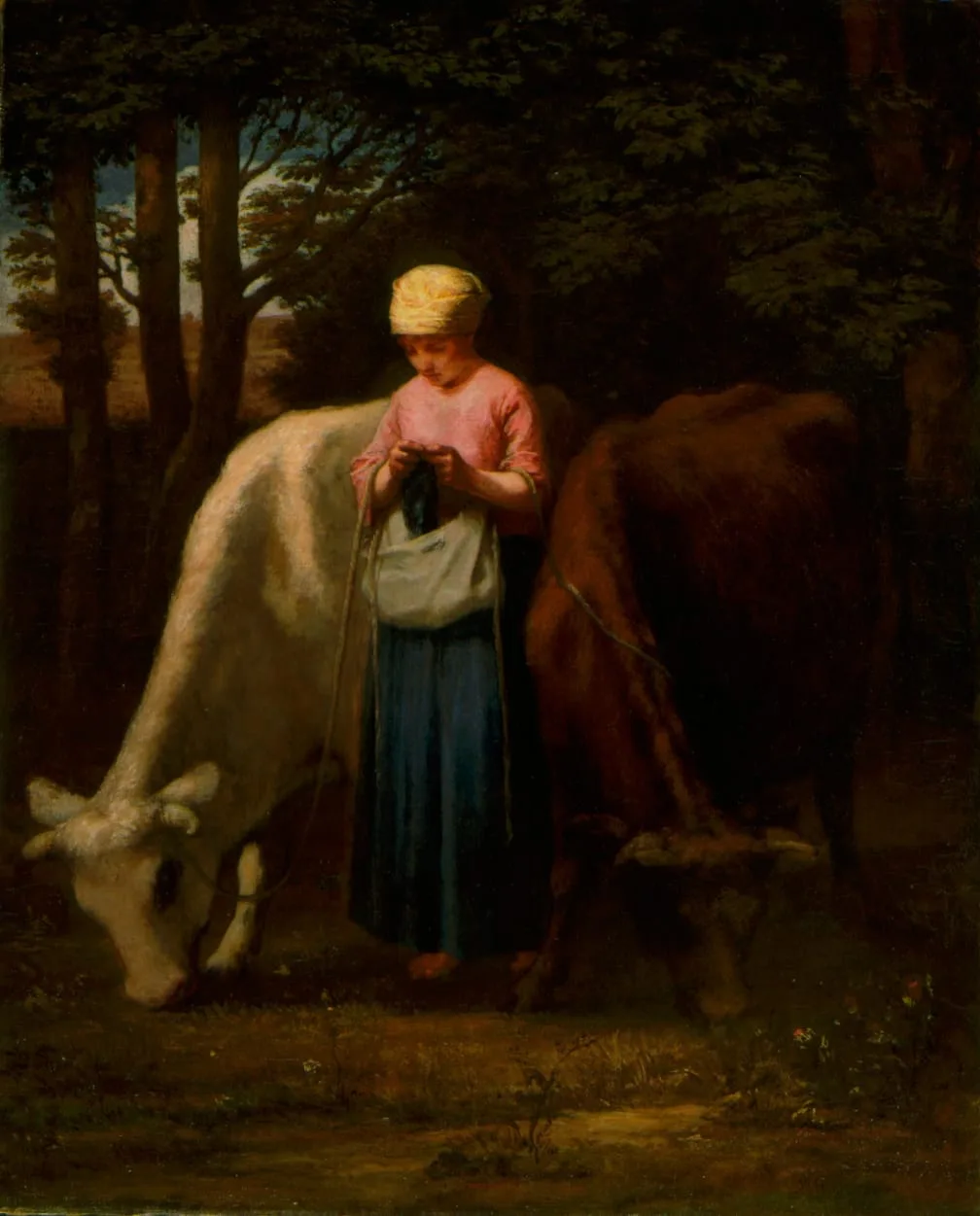 After his return to the United States in 1855, Hunt worked in Newport, Rhode Island, continuing to produce figure paintings reflecting the spell of Millet. Girl with Cows relates closely to the peasant images Hunt created while in France, in particular his On the Edge of the Forest, c. 1853 (Museum of Fine Arts, Boston), in which a woman stands next to a grazing cow in a forest glade. The image of a female peasant quietly involved in knitting or sewing, while tending farm animals, was a common theme in mid-century French art. Millet created several such images, including Peasant Woman Guarding Her Cow, 1852 (Museum Boymans-van Beuningen, Rotterdam), while Hunt lived at Barbizon.