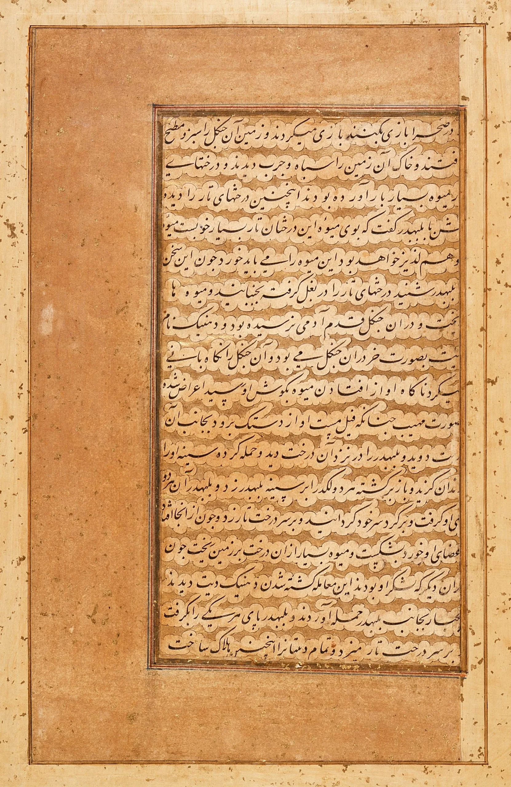The Harivamsha (Lineage of Hari [Vishnu]) is an appendix to the great Indian Sanskrit epic, the Mahabharata ([War of the] Great Bharatas), which is traditionally believed to have been composed by the revered sage Vyasa by the 1st century CE. It was translated into Persian for the Mughal Emperor Akbar (r. 1556-1605) by Mullah (or Mawlana) Sheri, who was killed in Kashmir in February 1586. This folio, M.83.1.7, and M.83.105.4 are from a widely dispersed Harivamsha manuscript that was a second copy of Akbar’s original volume. The folios were remounted into later borders in circa 1700. Verses from the text are on the obverse.