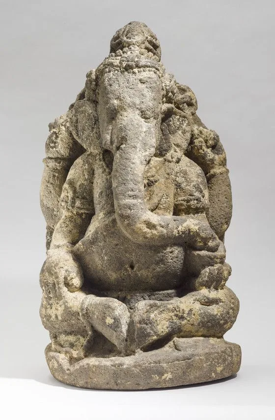 This four-armed representation of Ganesha mainly follows earlier Indian iconographic conventions. In his upper right hand, he holds a rosary (akshamala) symbolic of asceticism (now partially damaged). In his upper left hand, he holds a battle axe (parashu) for removing obstacles. His lower left hand holds a bowl of sweetmeats (laddu) that he is eating with his trunk. His lower right hand touches his calf and may have once held his broken tusk (danta), which according to various myths was lost in battle, used as a stylus, or as a projectile that he hurled at the moon when it ridiculed him for falling off his rat mount and bursting open his belly overstuffed with sweetmeats. The LACMA Ganesha deviates from the standard Indian iconography in his distinctive seated posture in which his feet are placed sole-to-sole resembling the butterfly pose (baddha konasana) of modern yoga. This iconographic innovation is primarily found in Indonesian art, although Malaysian and earlier Indian instances are known. See Robert L. Brown, "Ganesa in Southeast Asian Art: Indian Connections and Indigenous Developments," in Ganesh: Studies of an Asian God, ed. Robert L. Brown (Albany: State University of New York Press, 1991), pp. 185-186. See also M.83.221.3.